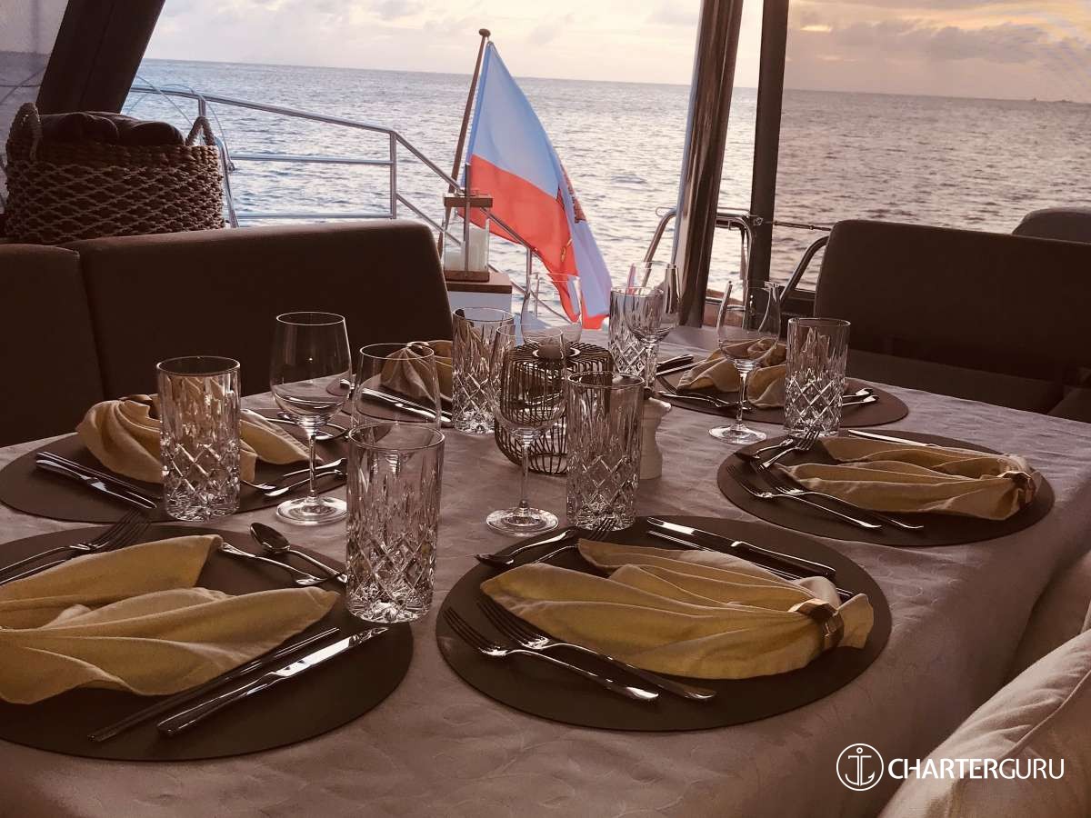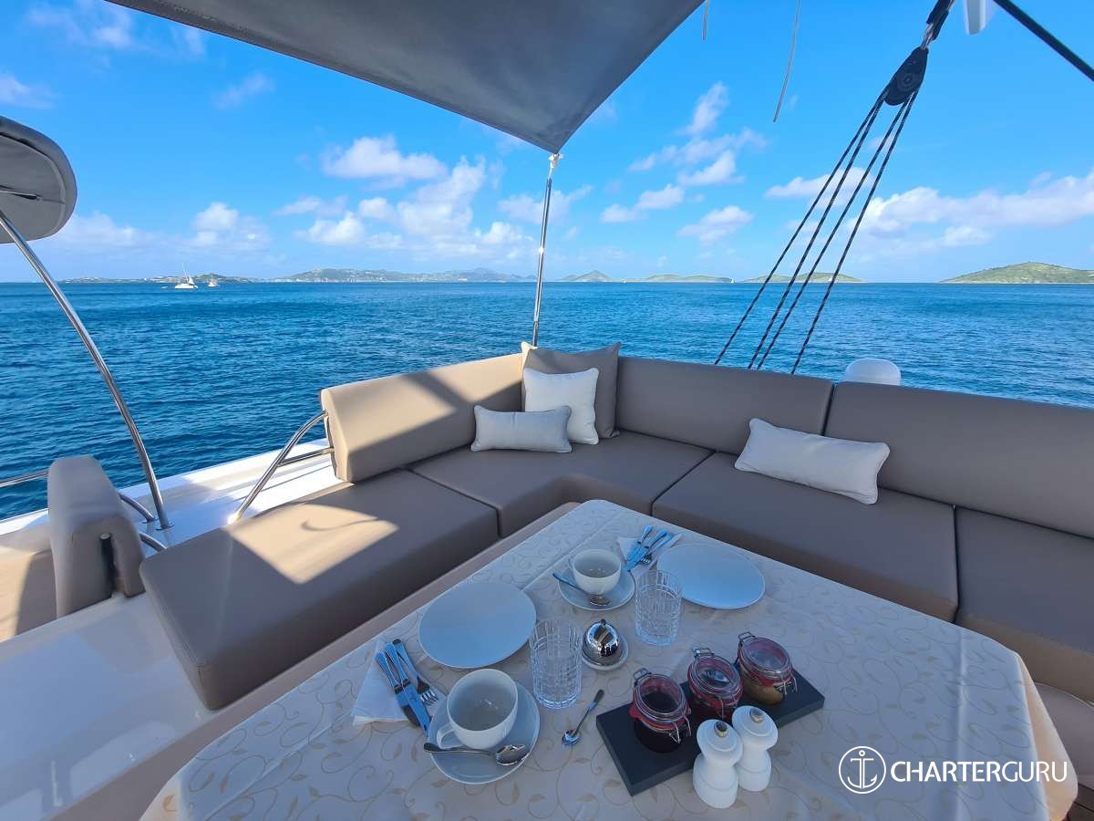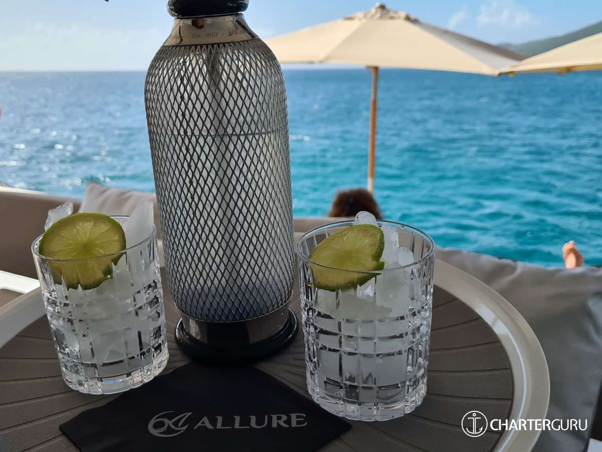 Allure is a 64ft Privilege owner edition and can accommodate up to 6 guests. The outstanding Owner's cabin and the 2 spacious Premium cabins are fully air conditioned and fitted with high end furniture and bedding. Of course all cabins have ensuite bathrooms and luxury toiletries are provided. One guest cabin can be converted from Queen to 2 single beds. All toilets have bidet function.Guests can enjoy their gourmet meals inside the European designed salon or outside in the spacious cockpit.
