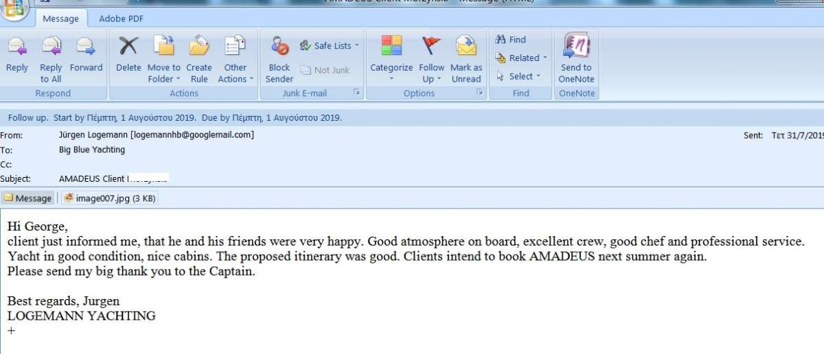 client just informed me, that he and his friends were very happy. Good atmosphere on board, excellent crew, good chef and professional service.