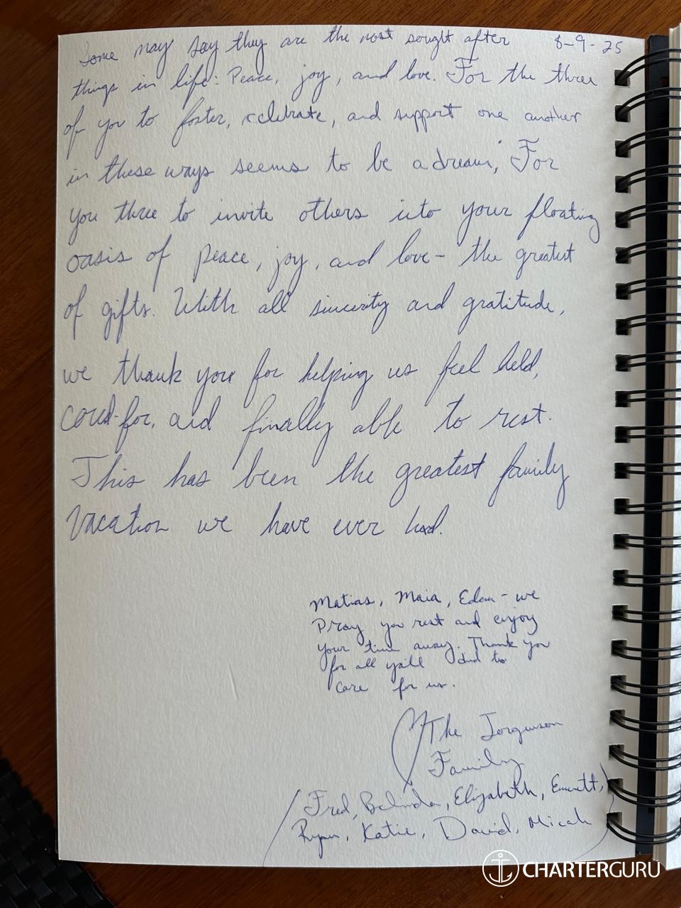Maia, your music was an absolute joy to listen to that filled our hearts with such pleasure. Don' t ever stop singing and playing the piano and guitar. Matias you made us always feel safe knowing you were in complete control of the boat. Eden, your quiet kindness was a joy to see and and really enjoyed everything you cooked for us. Until we meet again, thank you!!