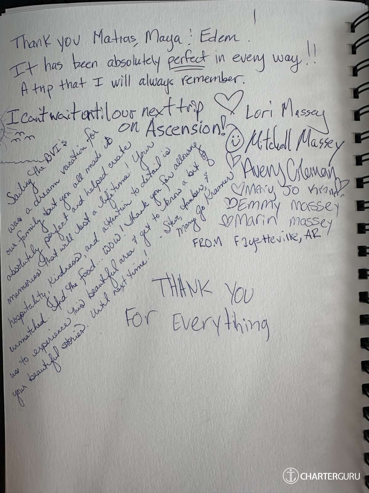 Maia, your music was an absolute joy to listen to that filled our hearts with such pleasure. Don' t ever stop singing and playing the piano and guitar. Matias you made us always feel safe knowing you were in complete control of the boat. Eden, your quiet kindness was a joy to see and and really enjoyed everything you cooked for us. Until we meet again, thank you!!