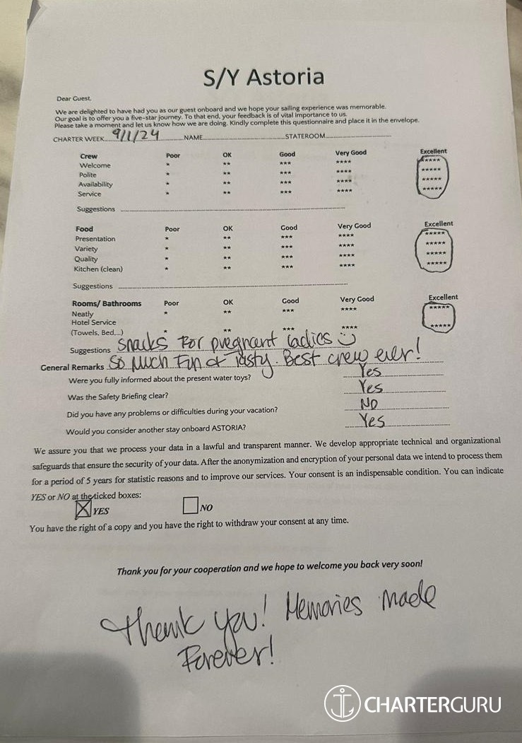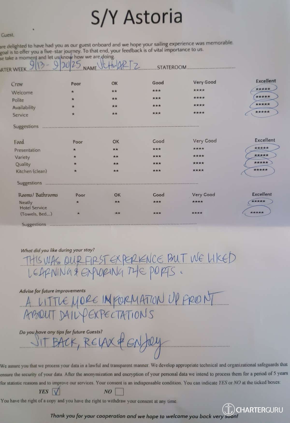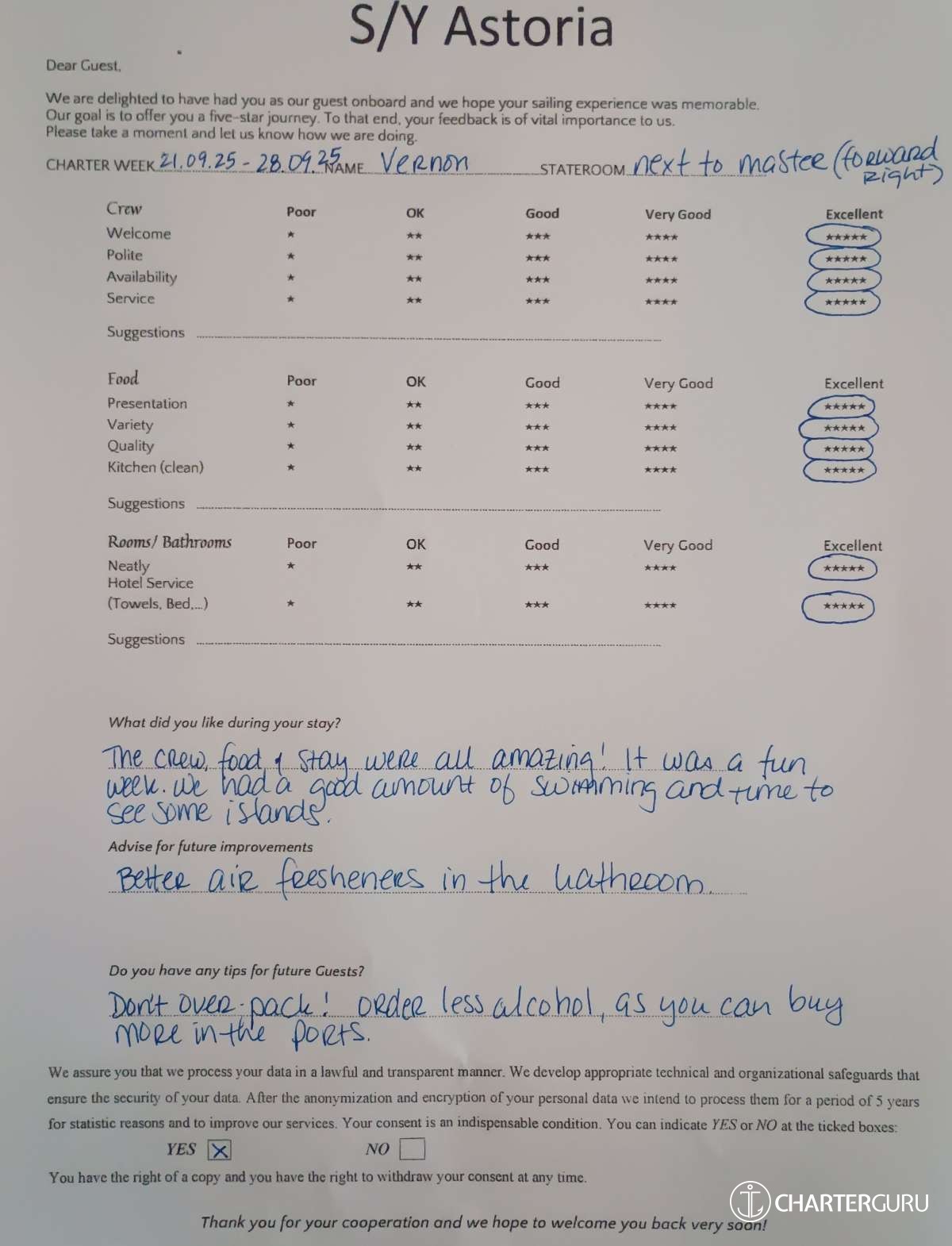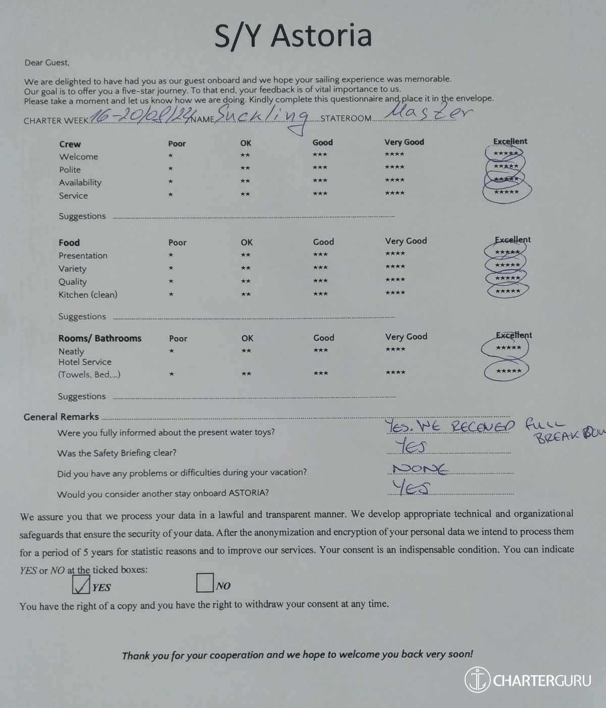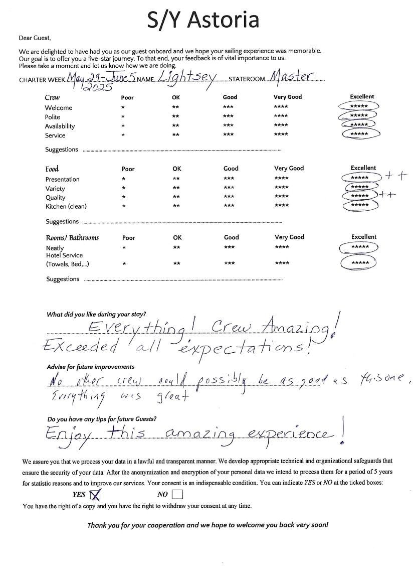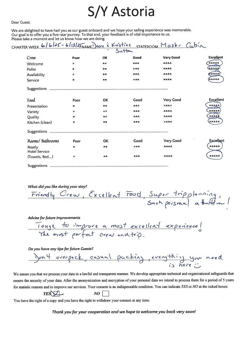 Whether enjoying a tranquil sail, a family celebration, or a sunset over crystal-clear waters, S/Y Astoria promises the perfect blend of adventure, elegance, and relaxation — a sailing experience unlike any other.
