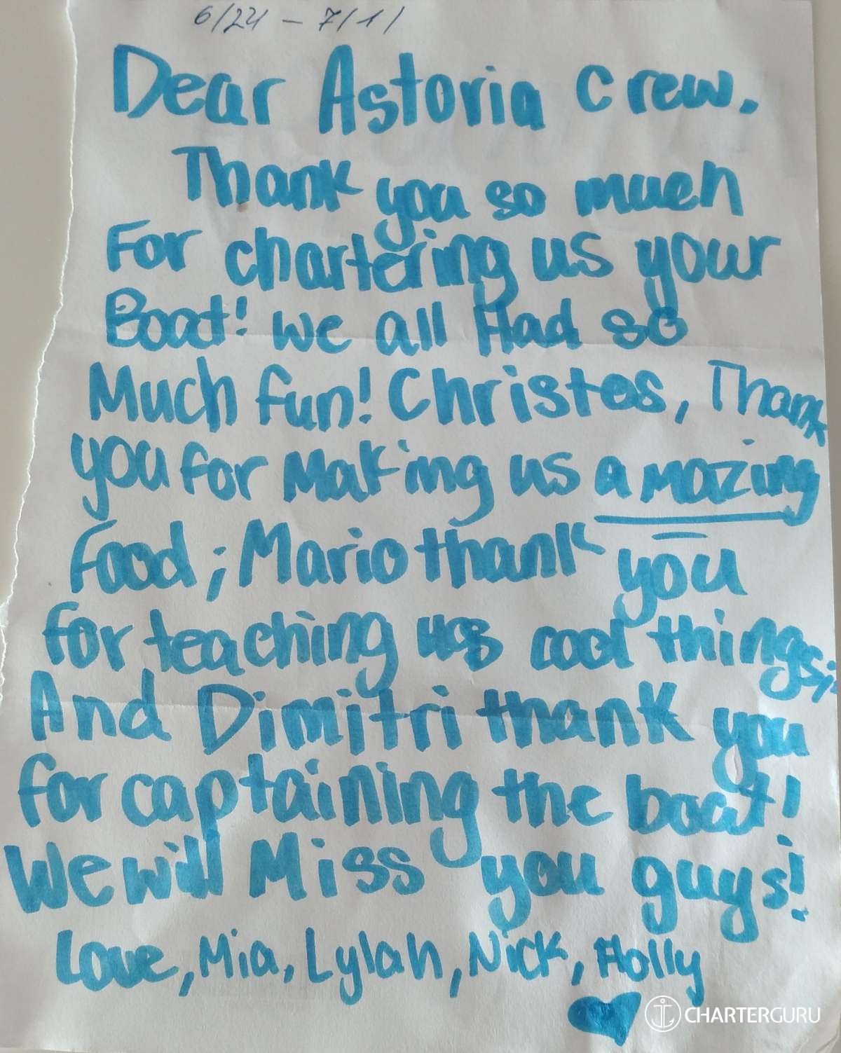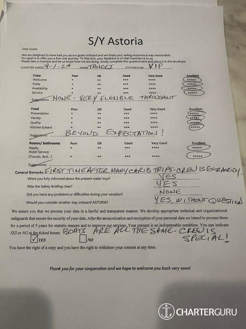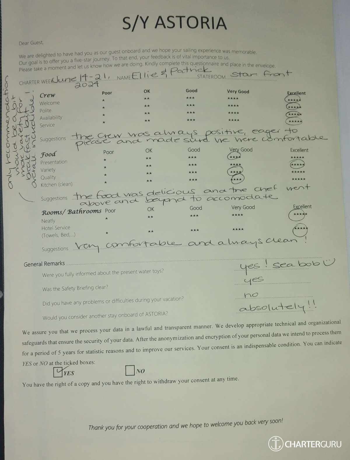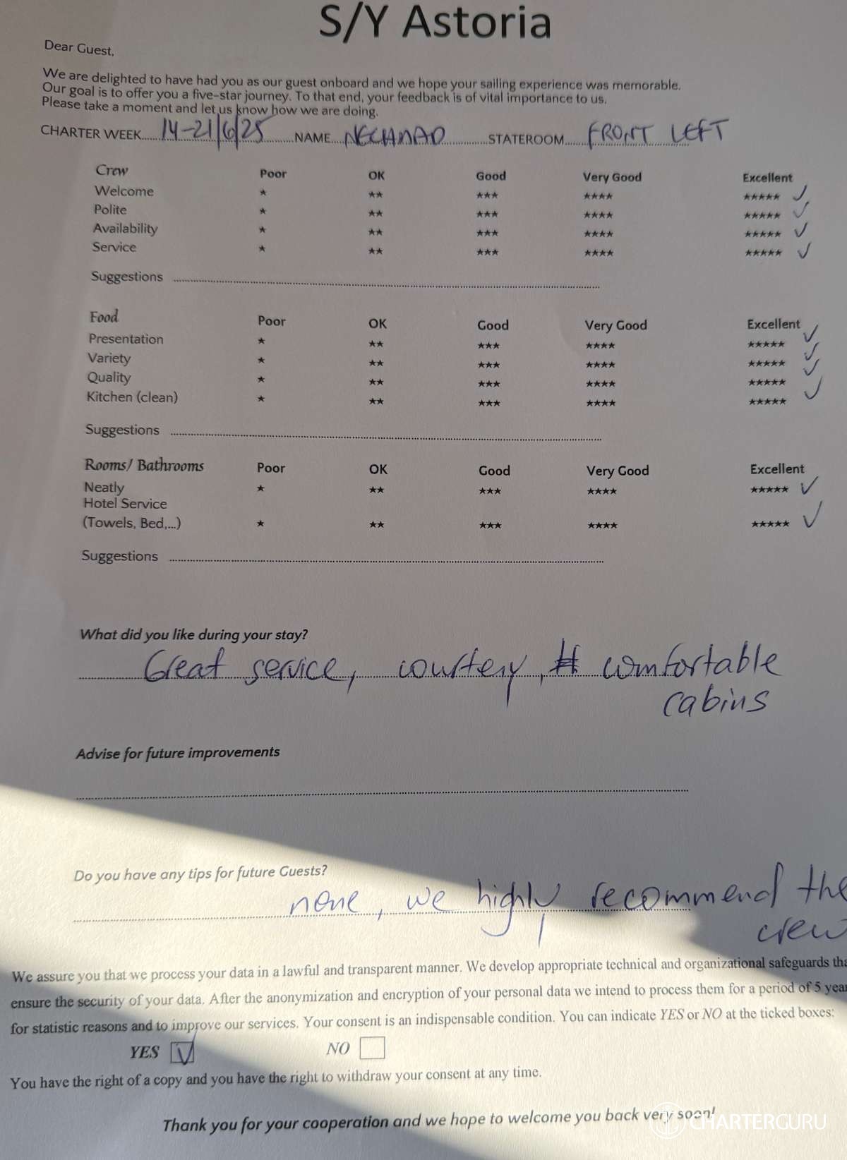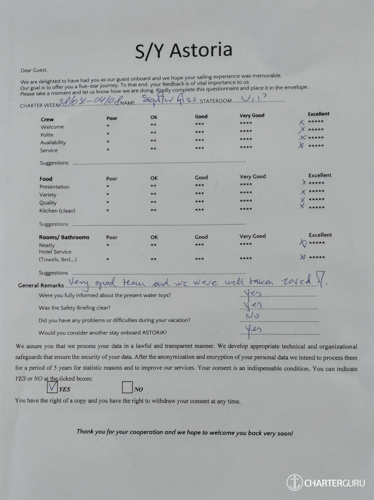 Whether enjoying a tranquil sail, a family celebration, or a sunset over crystal-clear waters, S/Y Astoria promises the perfect blend of adventure, elegance, and relaxation — a sailing experience unlike any other.