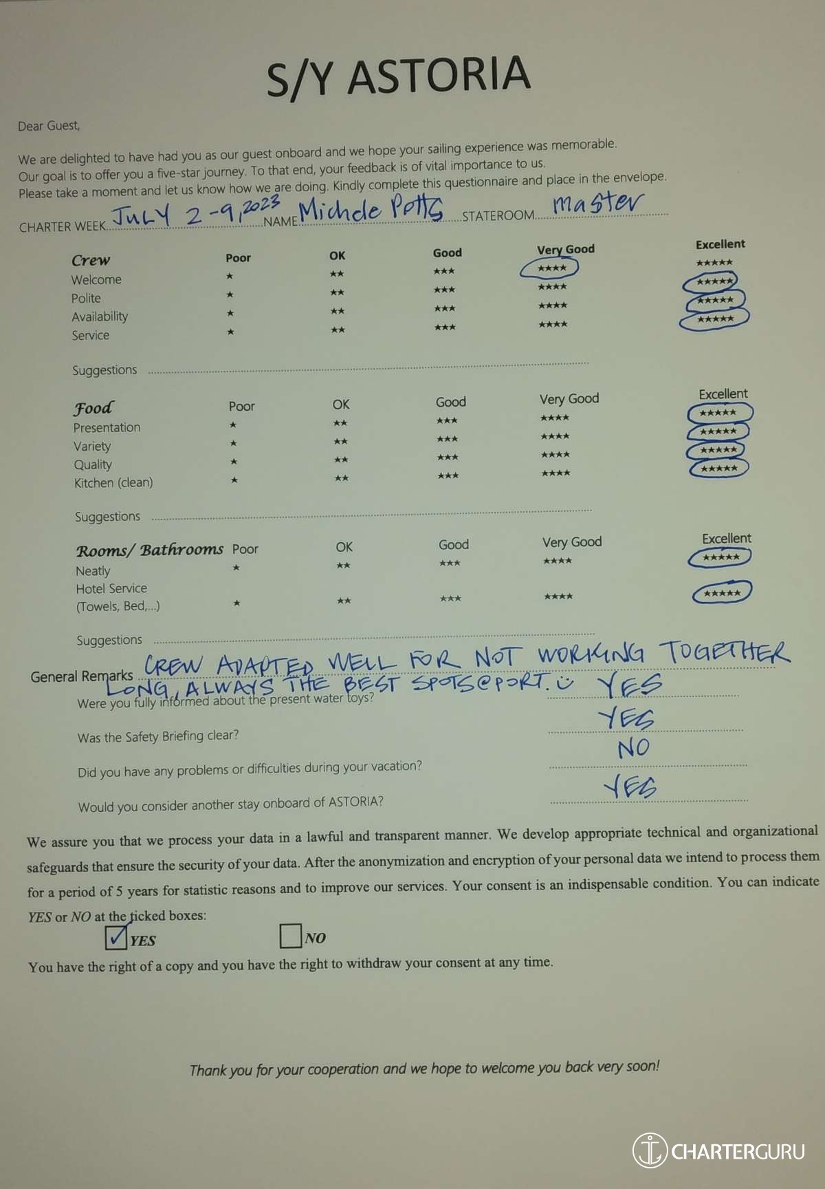 A professional crew of three — captain, hostess, and chef — delivers impeccable service, catering to every guest’s needs with enthusiasm and attention to detail. From expertly prepared meals to curated itineraries and watersport adventures, the Astoria experience is designed to delight.