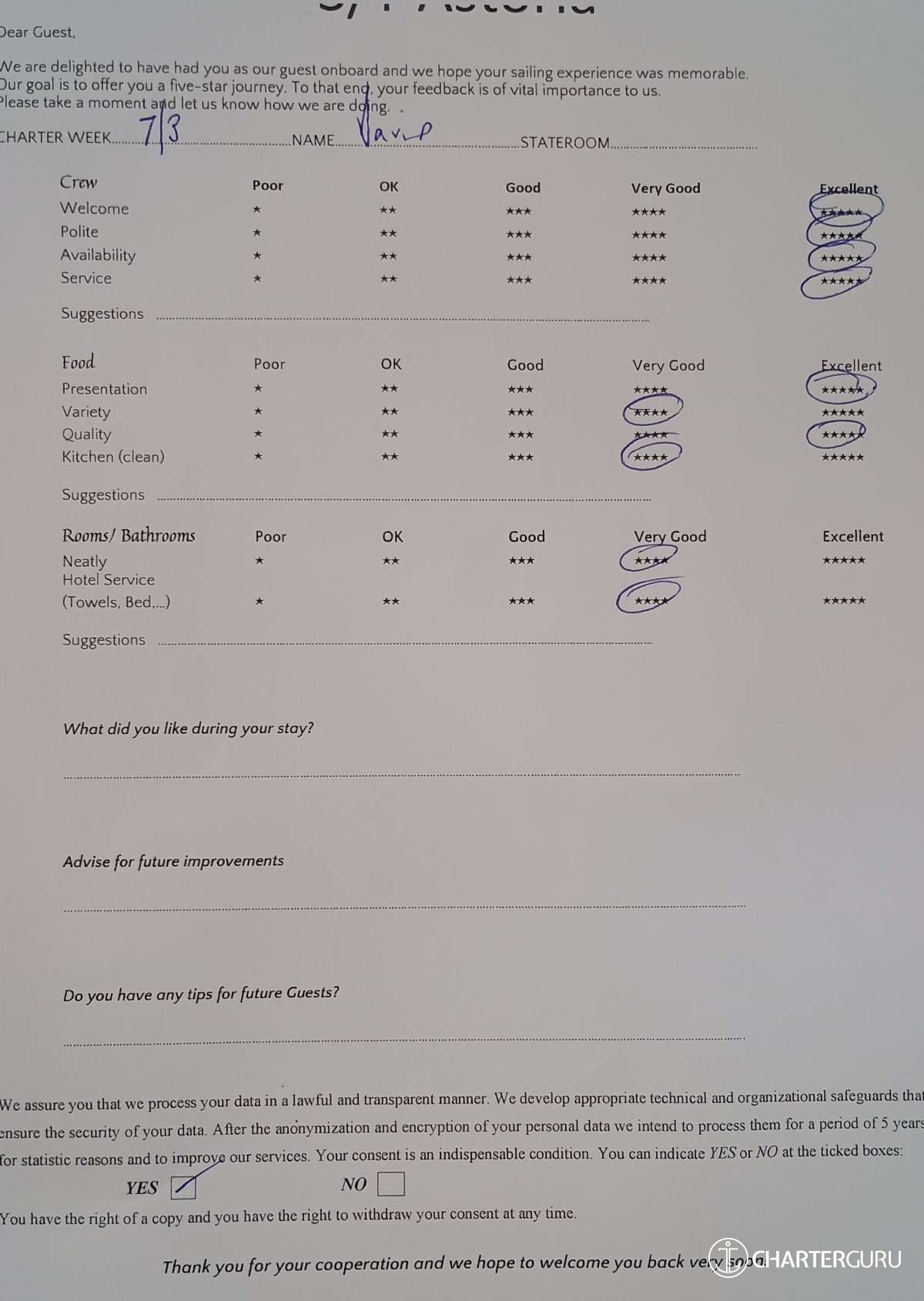 For a sailing catamaran like ASTORIA, the expected APA is 20% to 35% of the charter price (€4,980 - €8,715), making the charter cost €29,880 to €33,615. Exact amount will be confirmed after inquiry.