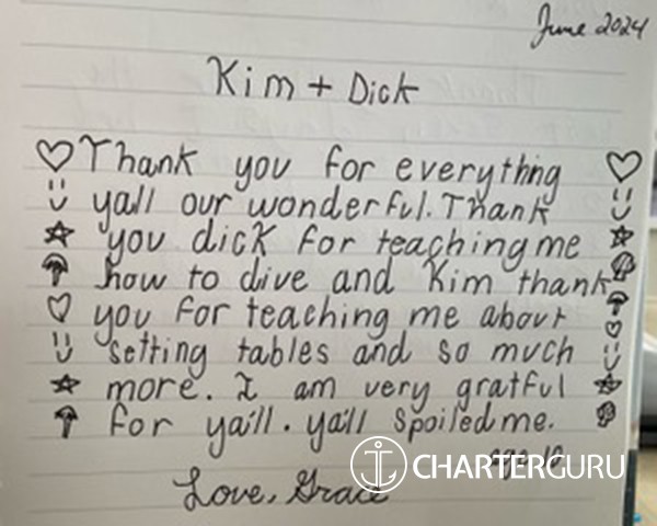 Captain Dick and Chef Kim's teamwork and dedication to providing an exceptional sailing experience were evident in every aspect of our trip. Their warm hospitality, professionalism, and genuine passion for what they do created an atmosphere of camaraderie and joy that will be remembered fondly by all of us.
