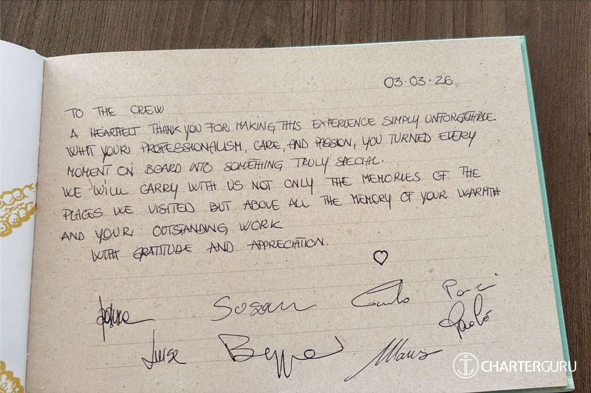 A heartfelt thank you for making this experience simply unforgettable. With your professionalism, care, and passion, you turned every moment on board into something truly special.