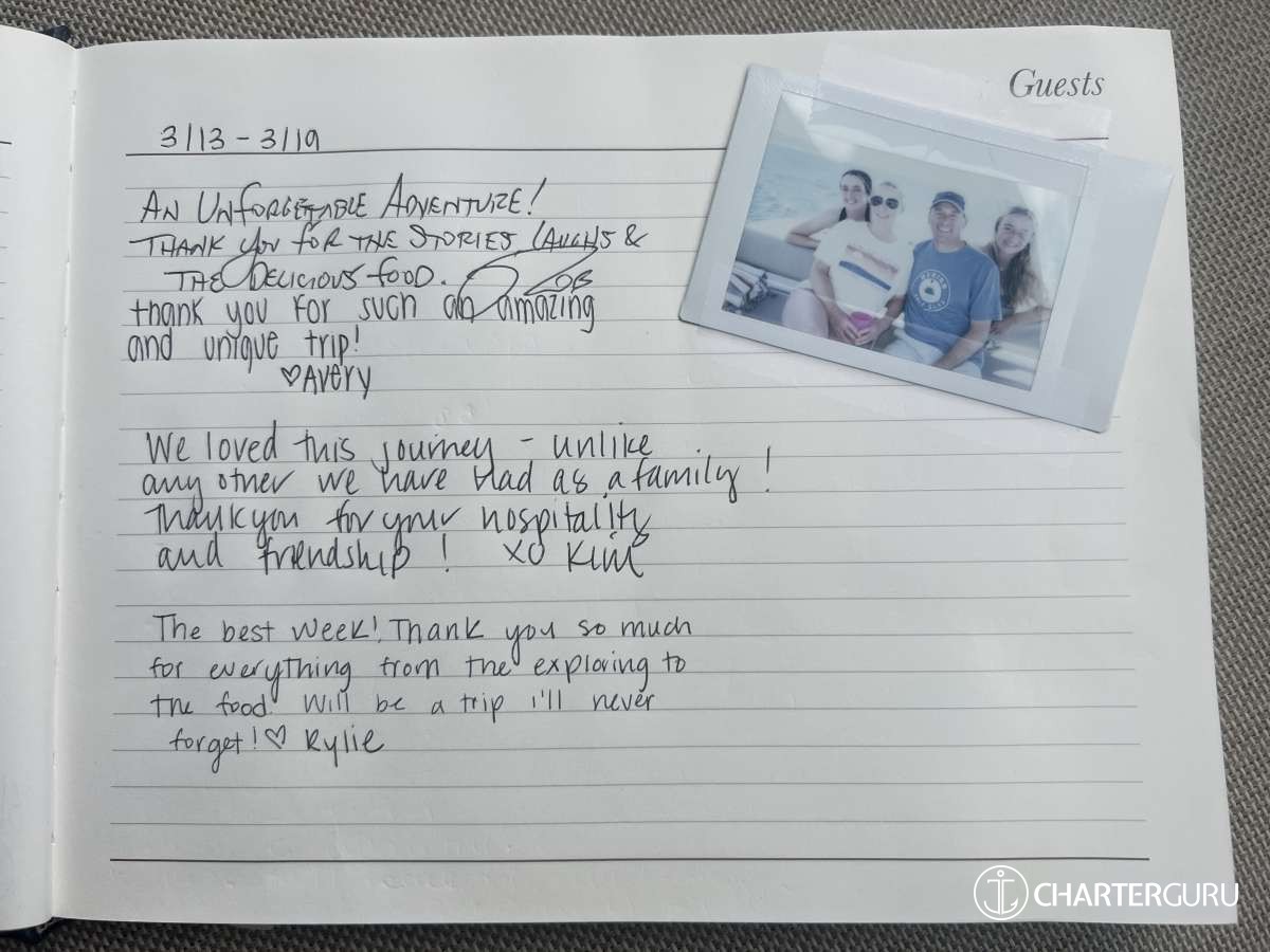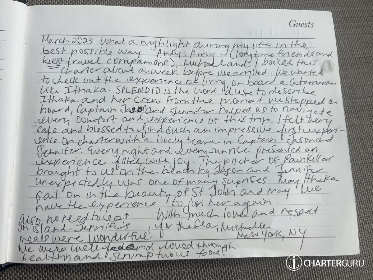 Thank you for an amazing week! Everything exceeded our expectations... the sailing, food, drinks, ports, excursions. We hope to see you sometime in the future whether in the islands or New England. Your skill and thoughtfulness and care, are second to none. Love every minute aboard with you!