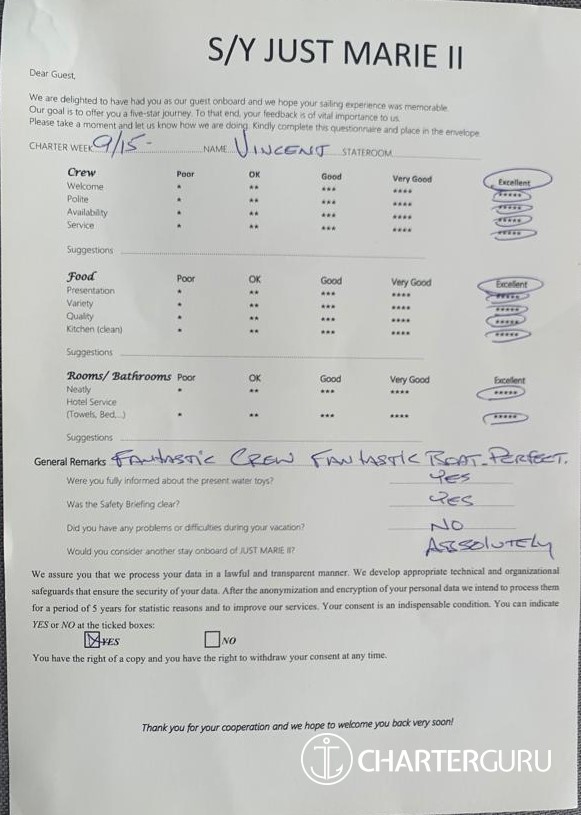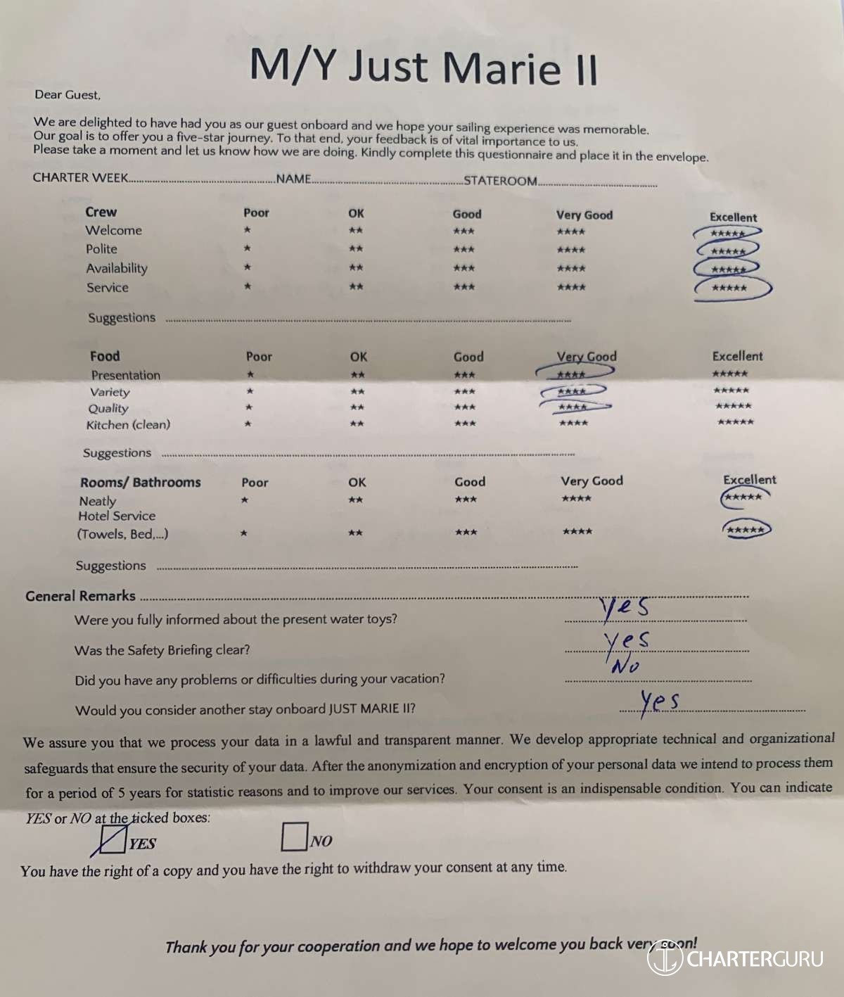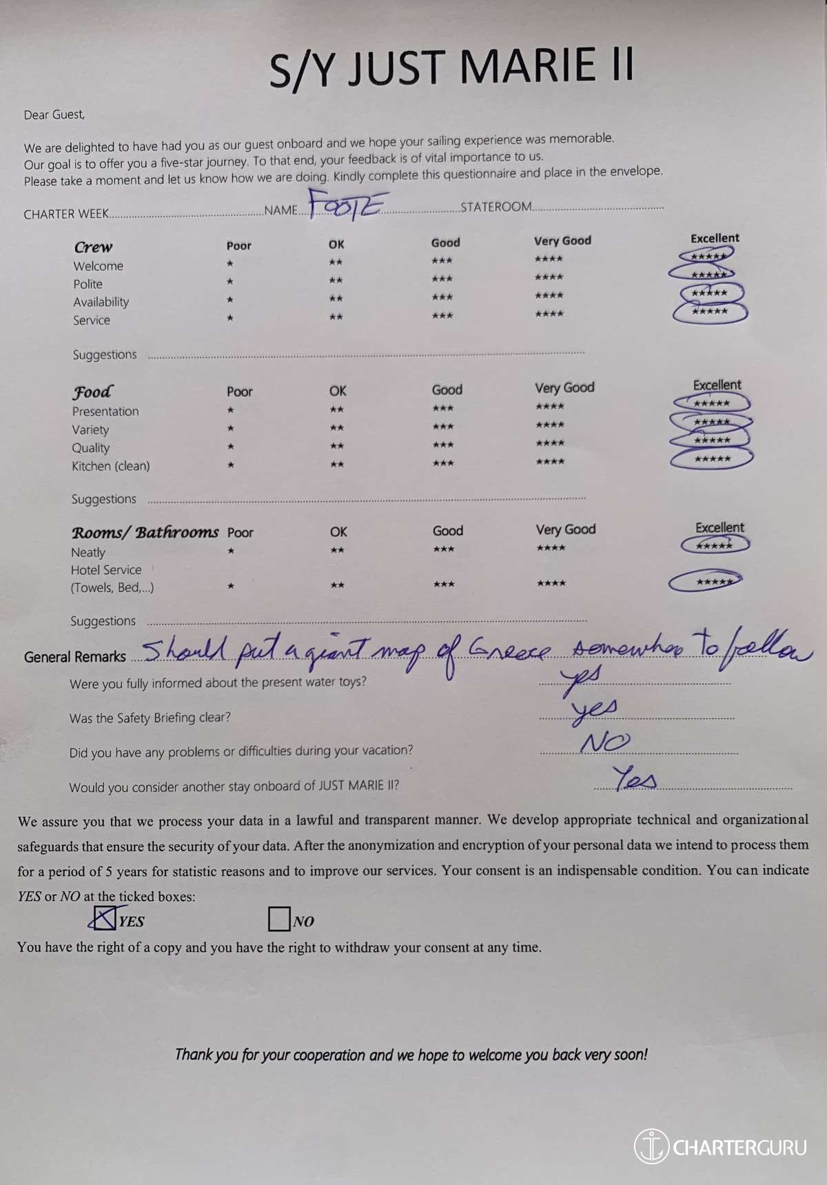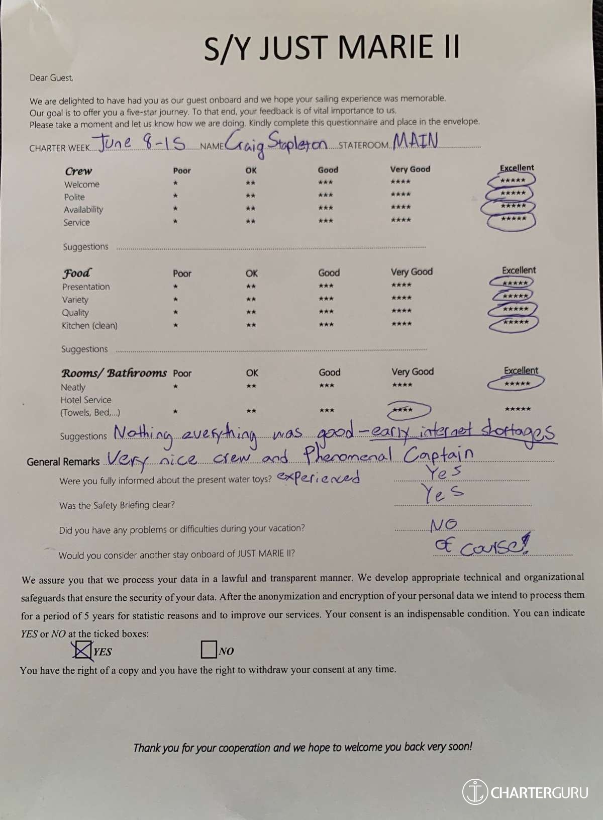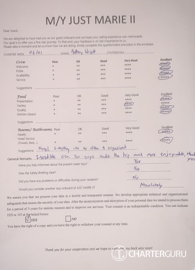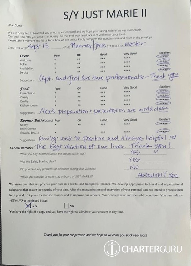 For a power catamaran like Just Marie 2, the expected APA is 20% to 35% of the charter price (€9,800 - €17,150), making the charter cost €58,800 to €66,150. Exact amount will be confirmed after inquiry.