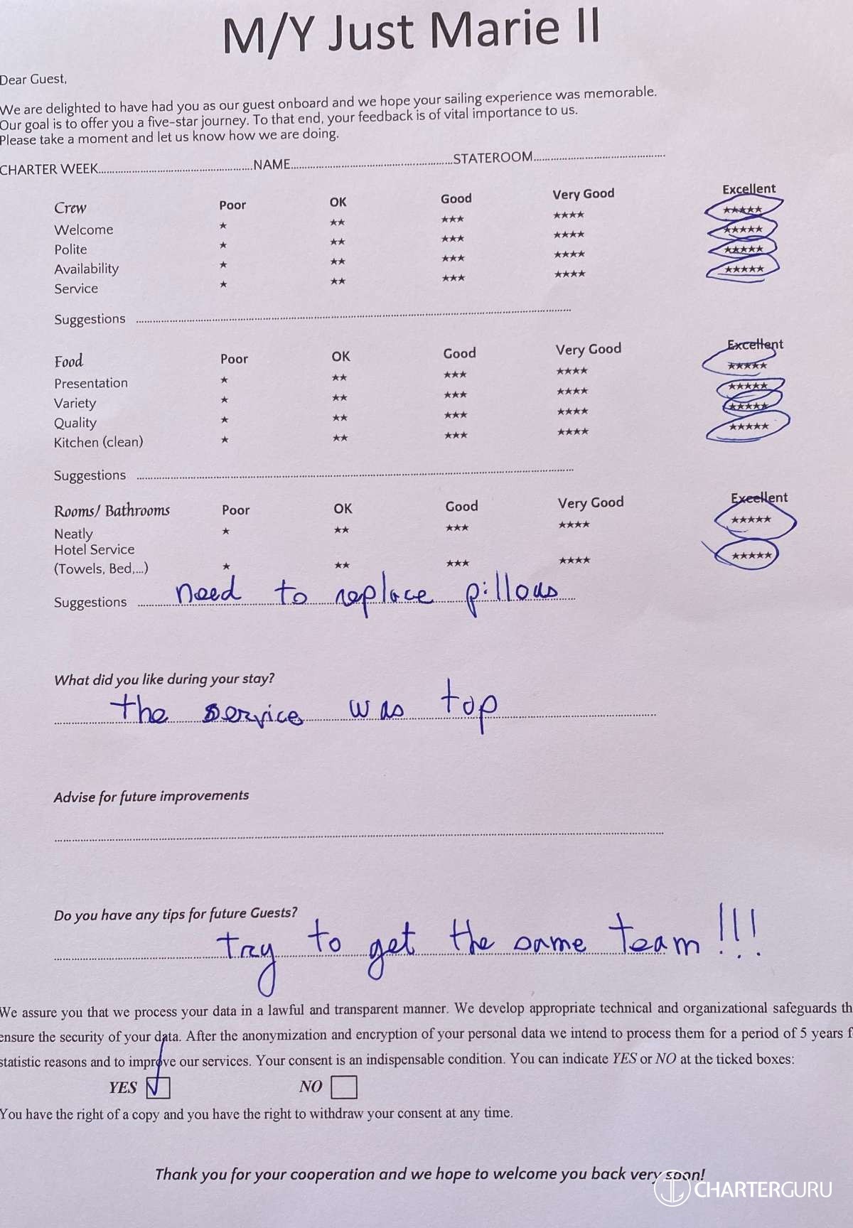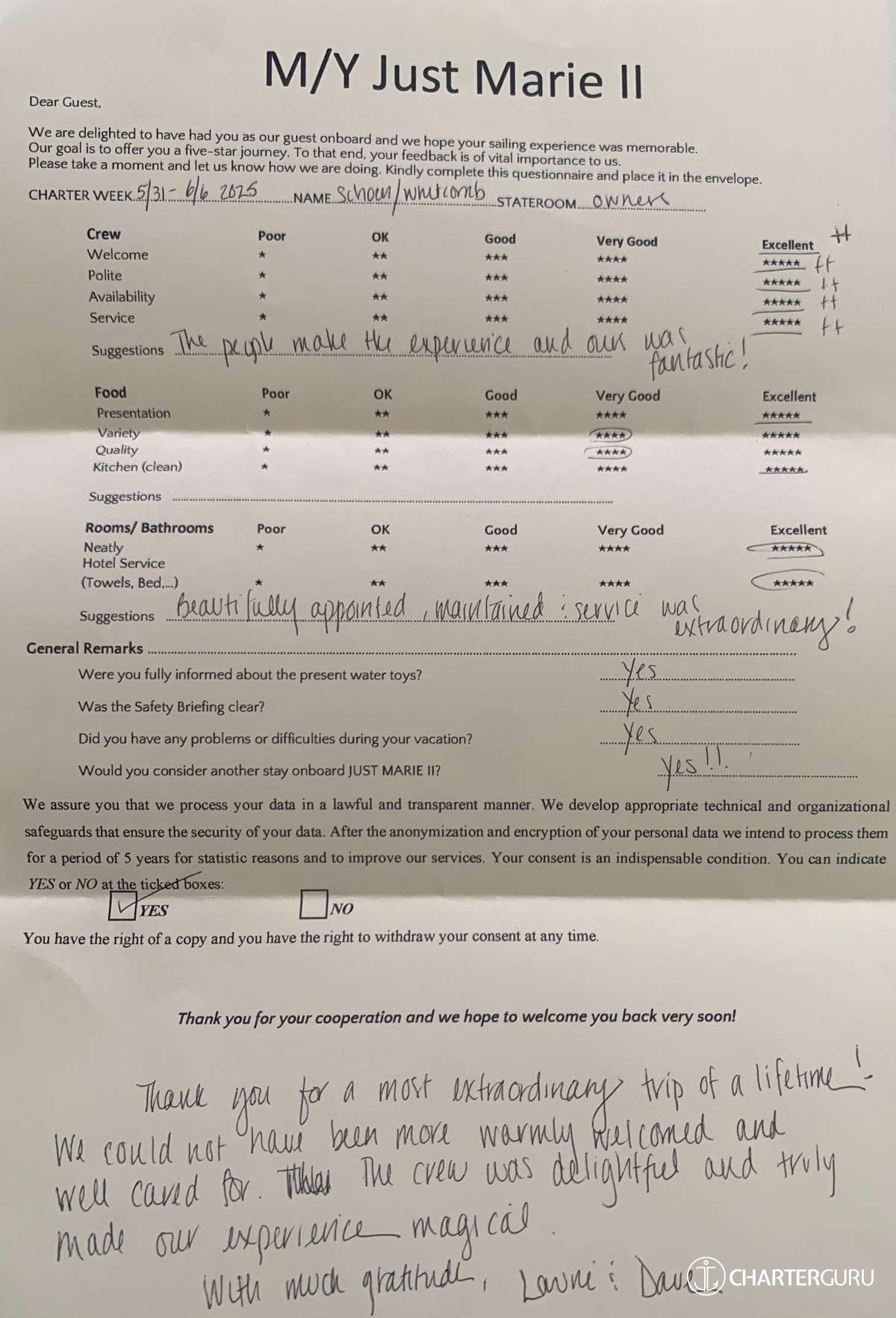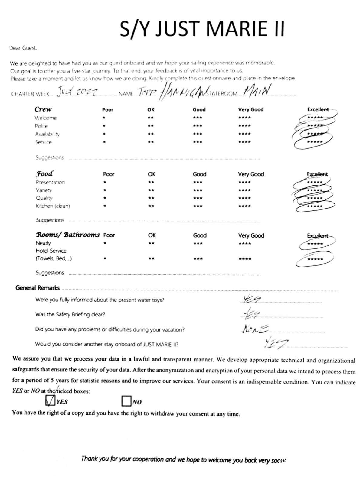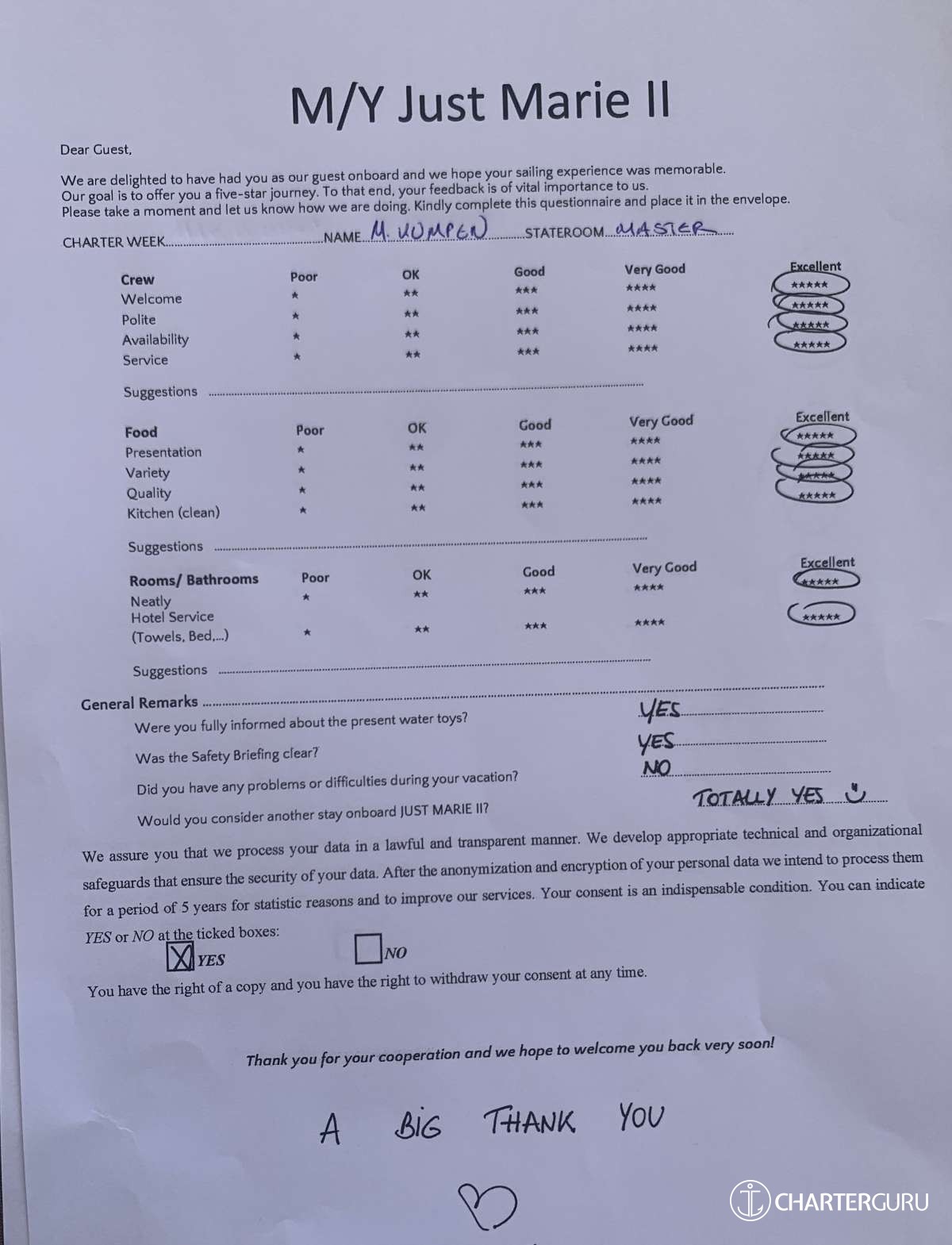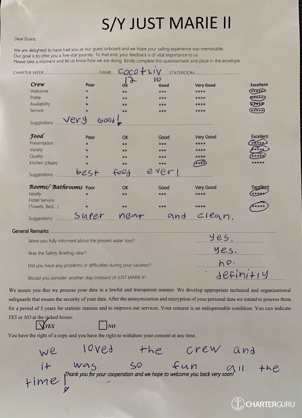 For a power catamaran like Just Marie 2, the expected APA is 20% to 35% of the charter price (€9,800 - €17,150), making the charter cost €58,800 to €66,150. Exact amount will be confirmed after inquiry.
