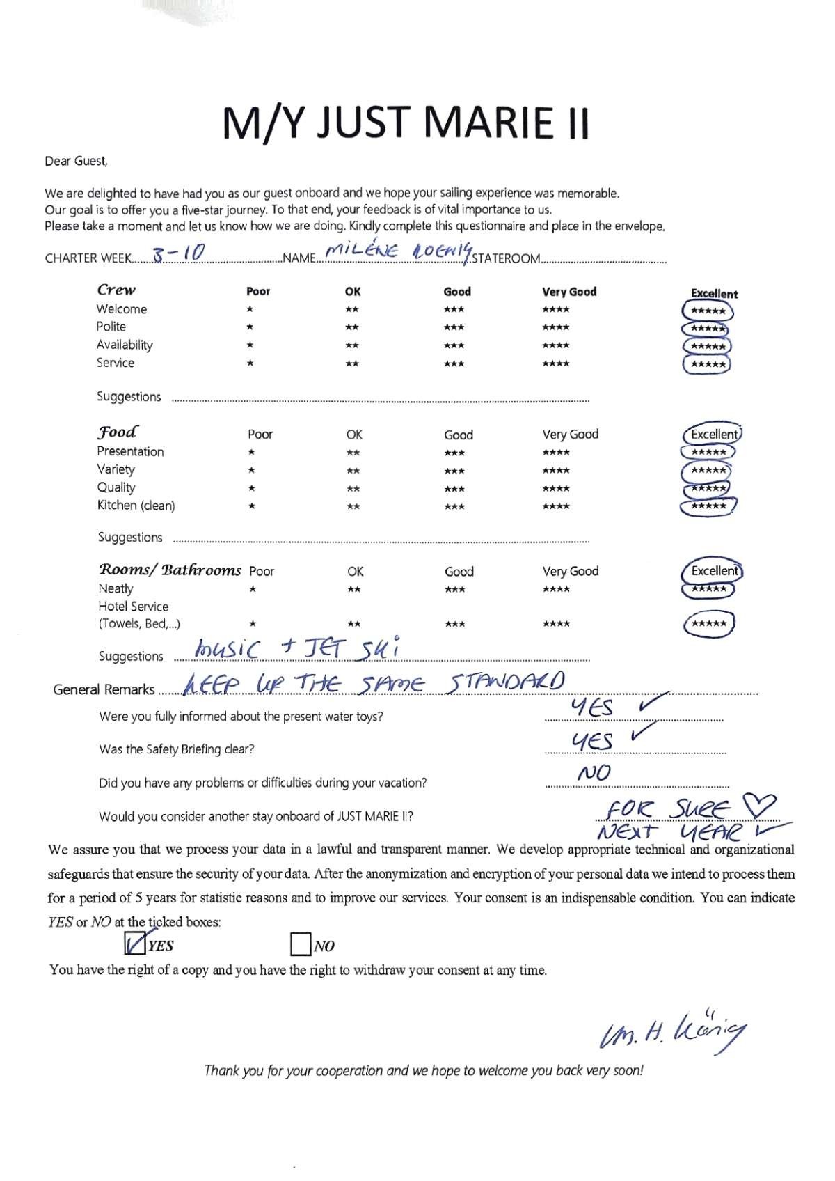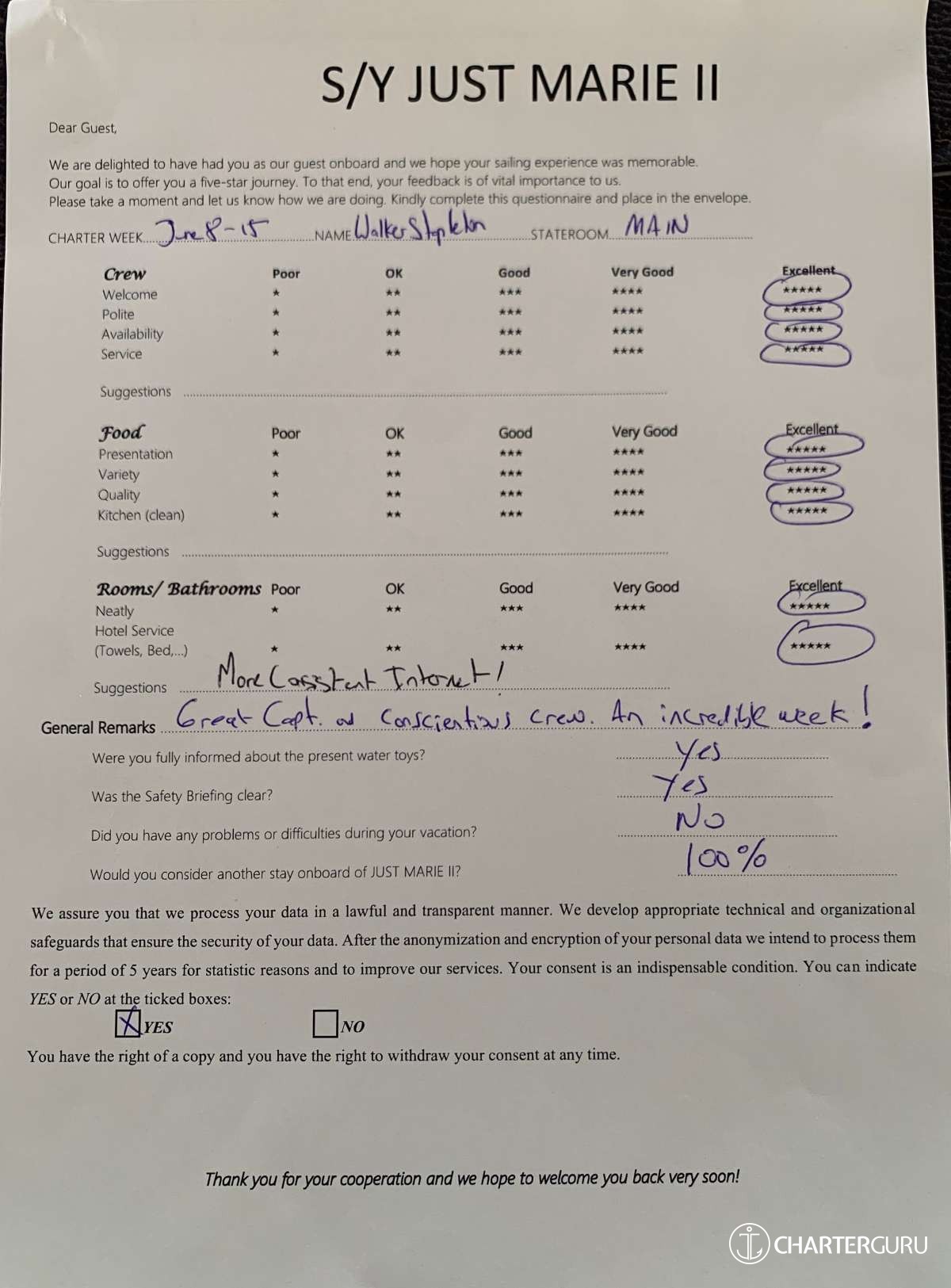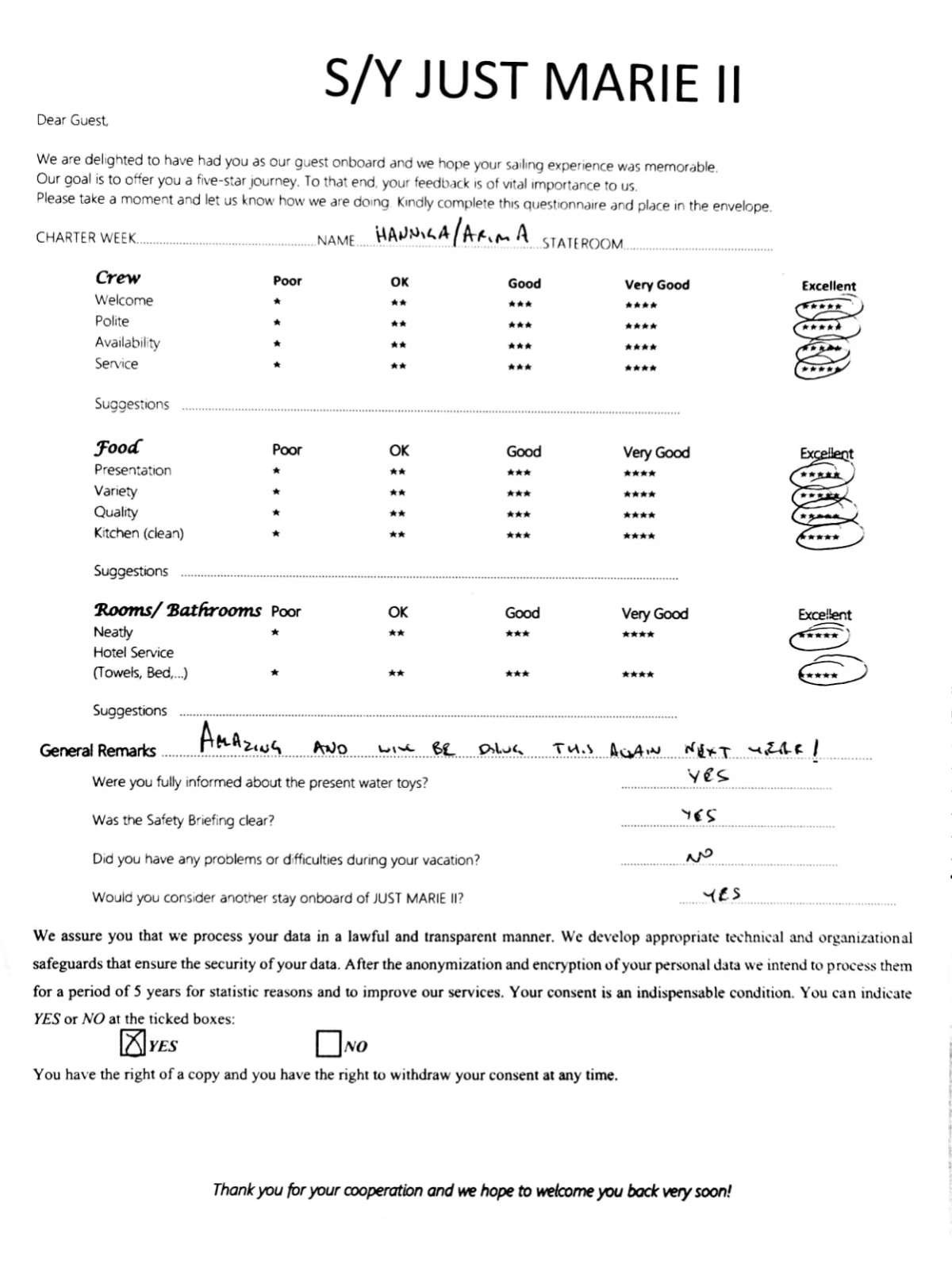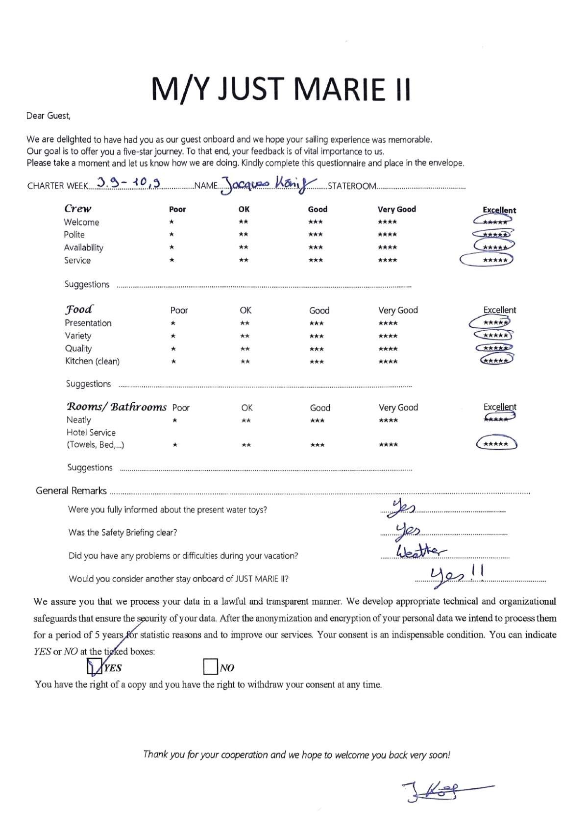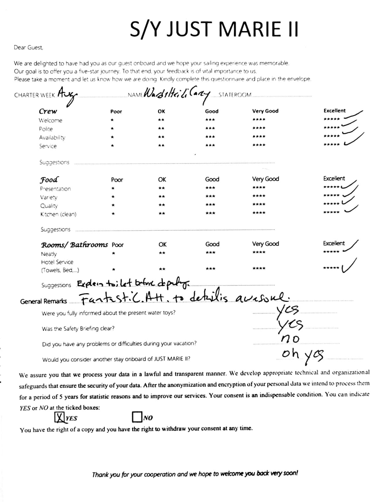 For a power catamaran like Just Marie 2, the expected APA is 20% to 35% of the charter price (€9,800 - €17,150), making the charter cost €58,800 to €66,150. Exact amount will be confirmed after inquiry.