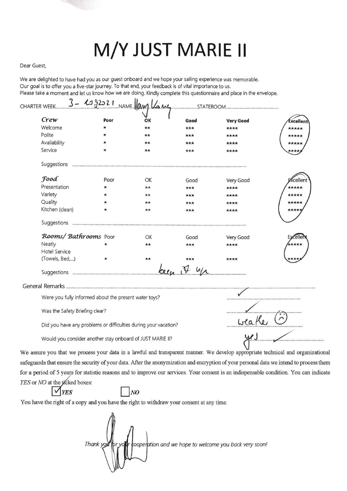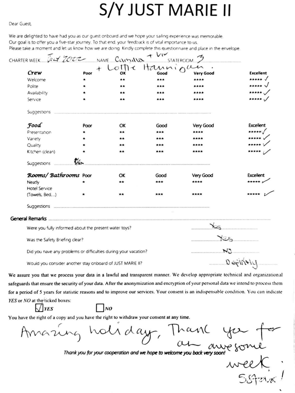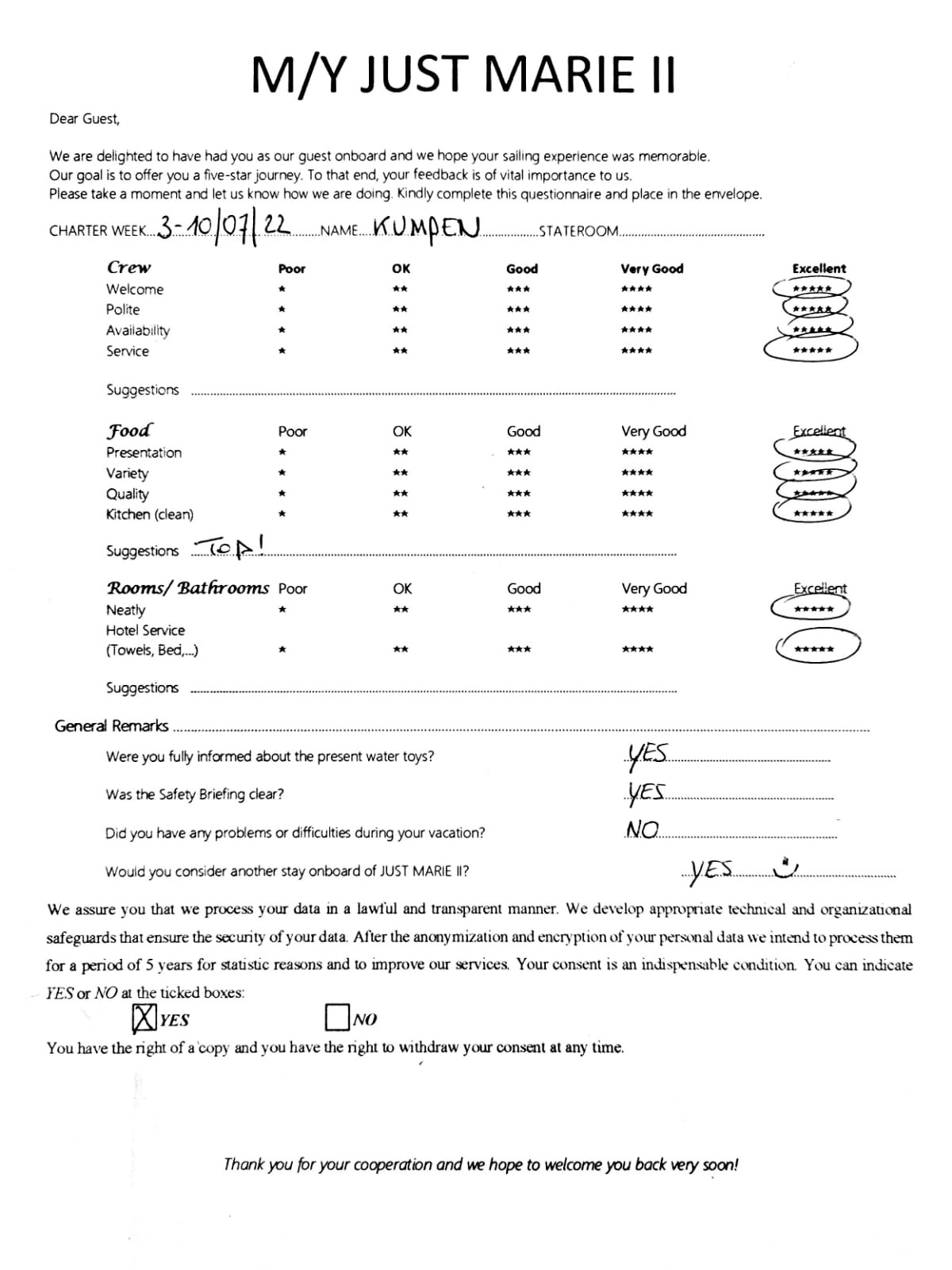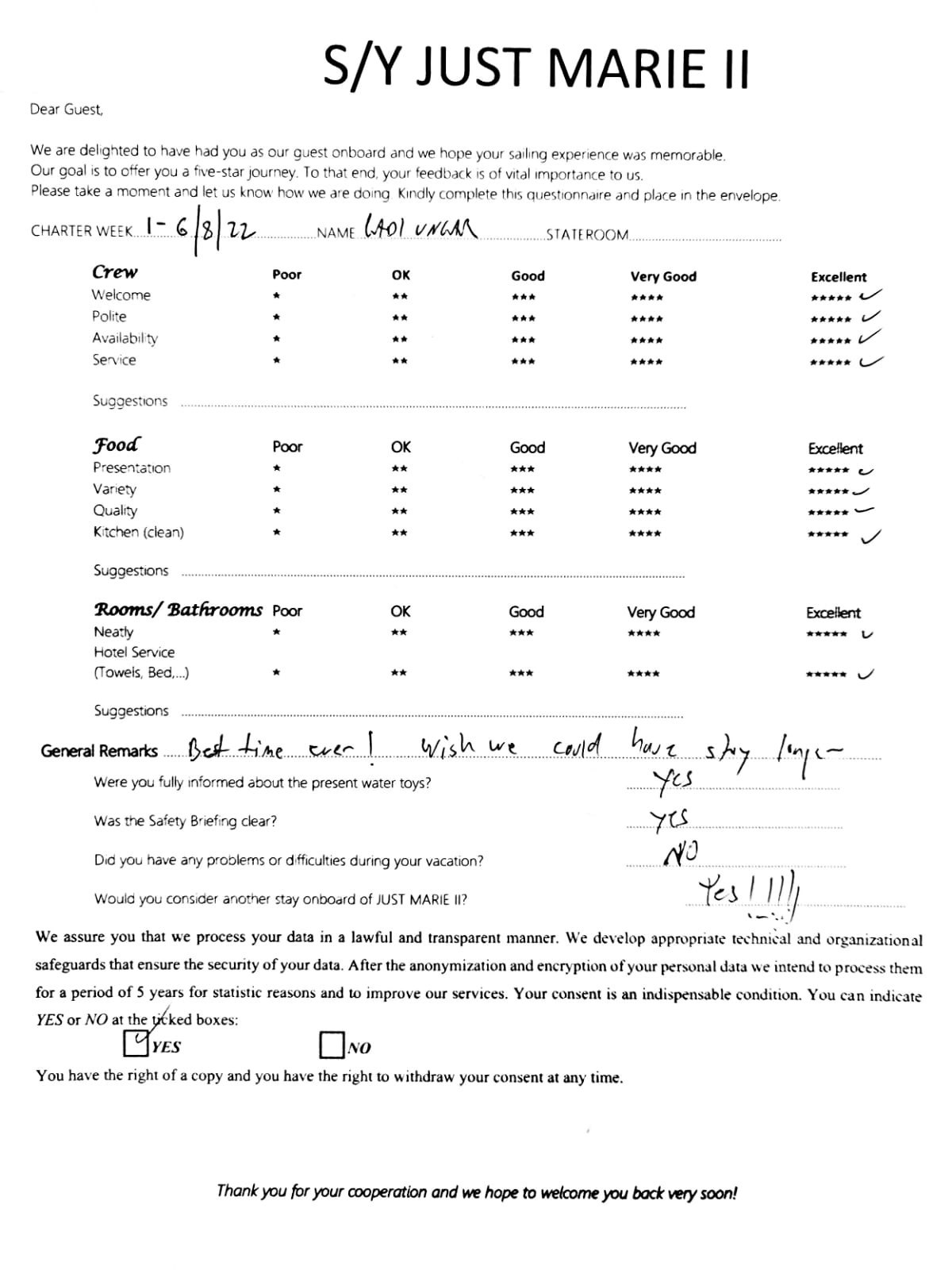 For a power catamaran like Just Marie 2, the expected APA is 20% to 35% of the charter price (€9,800 - €17,150), making the charter cost €58,800 to €66,150. Exact amount will be confirmed after inquiry.