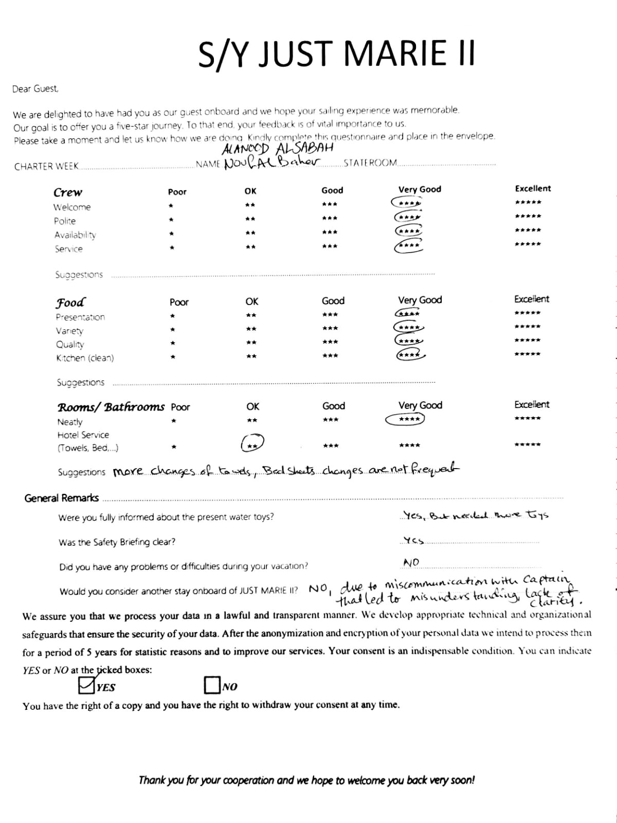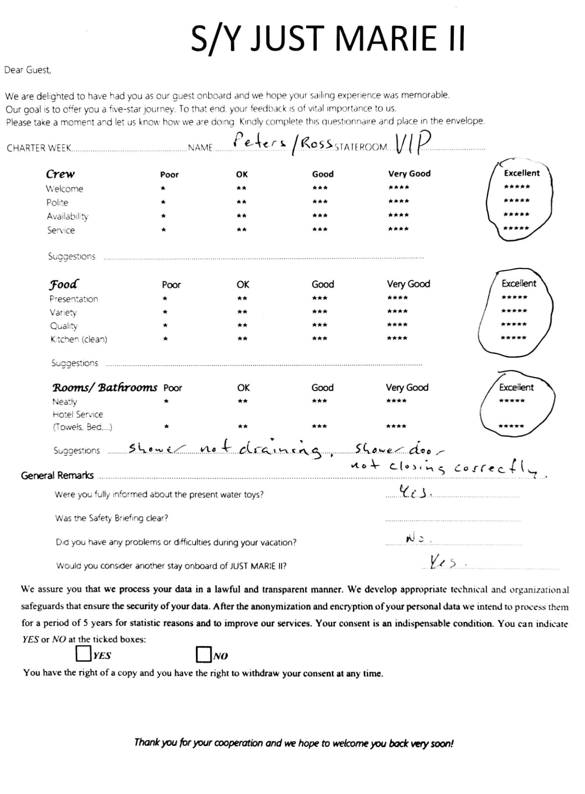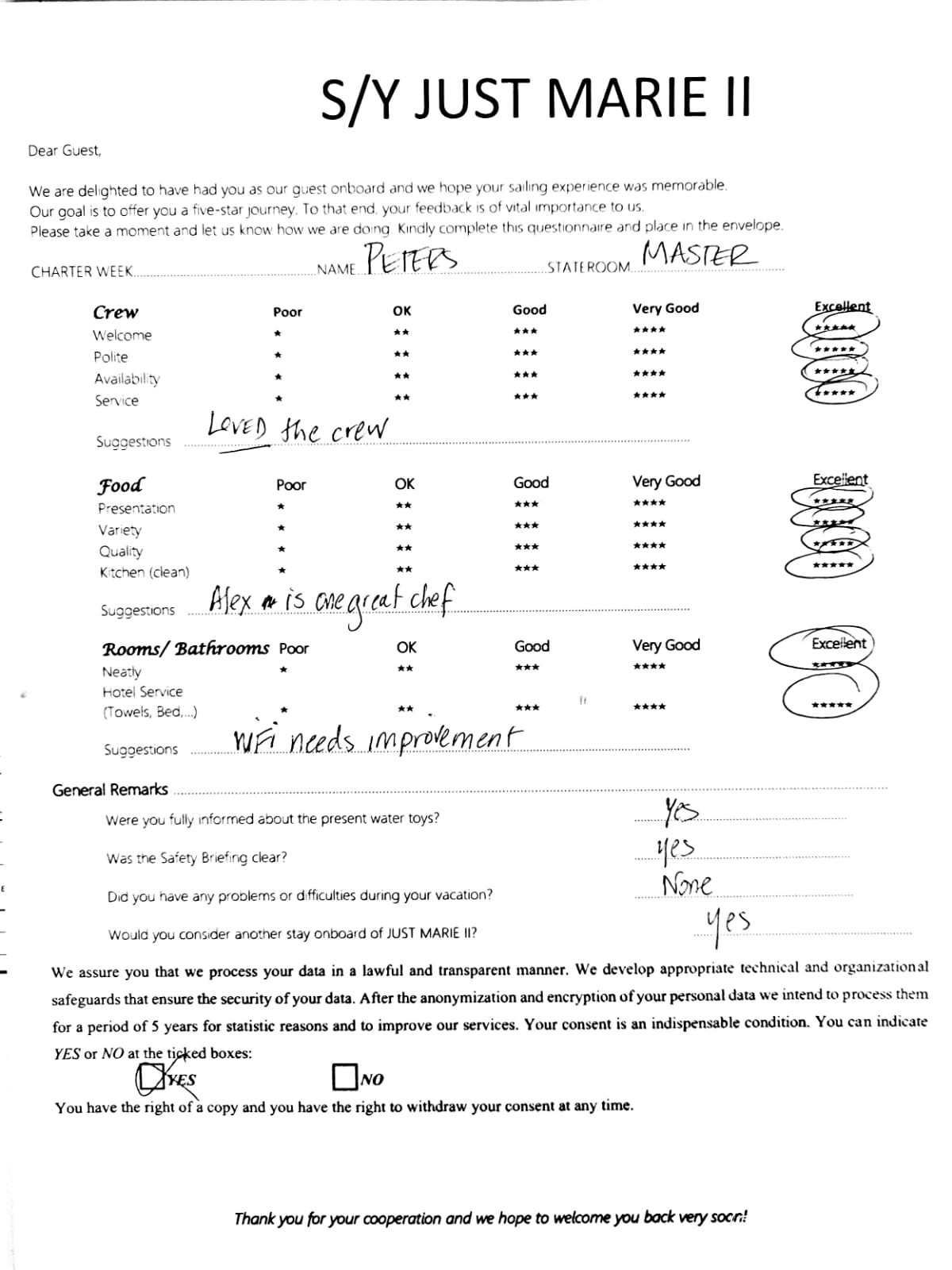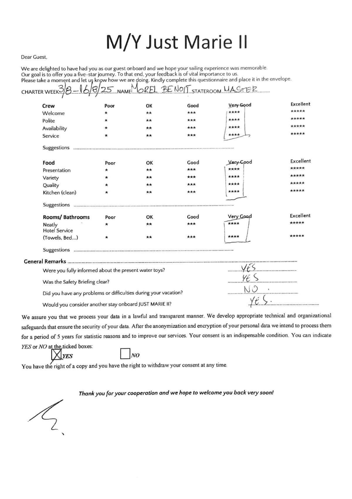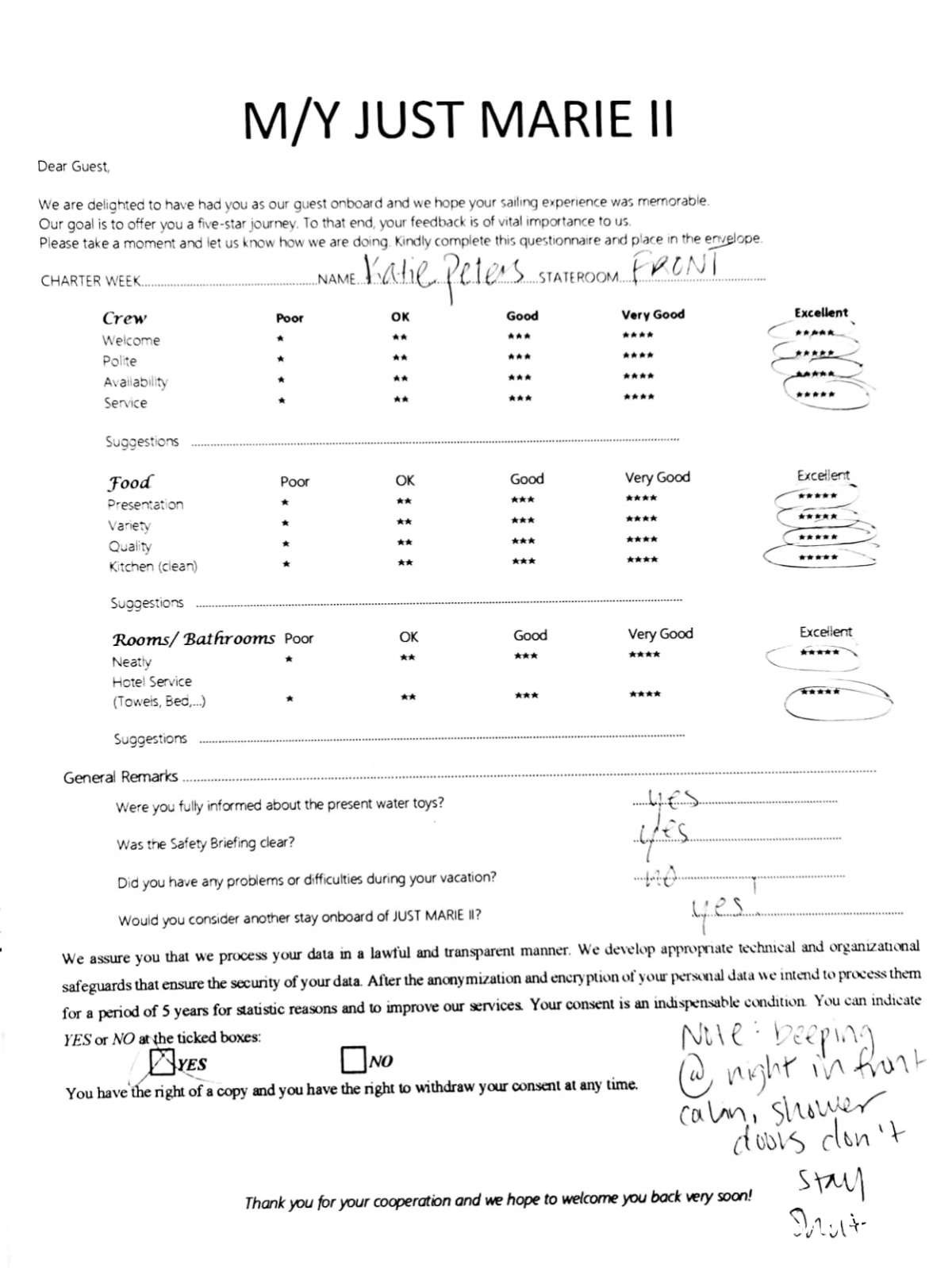 For a power catamaran like Just Marie 2, the expected APA is 20% to 35% of the charter price (€9,800 - €17,150), making the charter cost €58,800 to €66,150. Exact amount will be confirmed after inquiry.