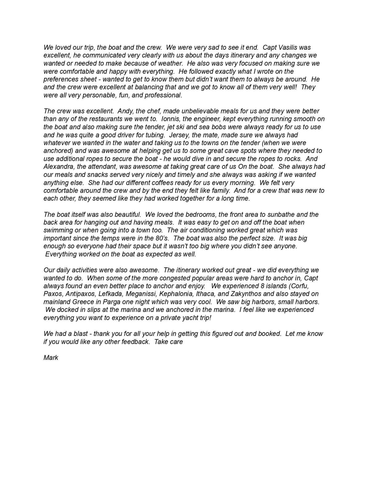 | # of charter days | Base Price | APA (deposit for provisioning, fuel, docking fees, etc) | Total | Note | |