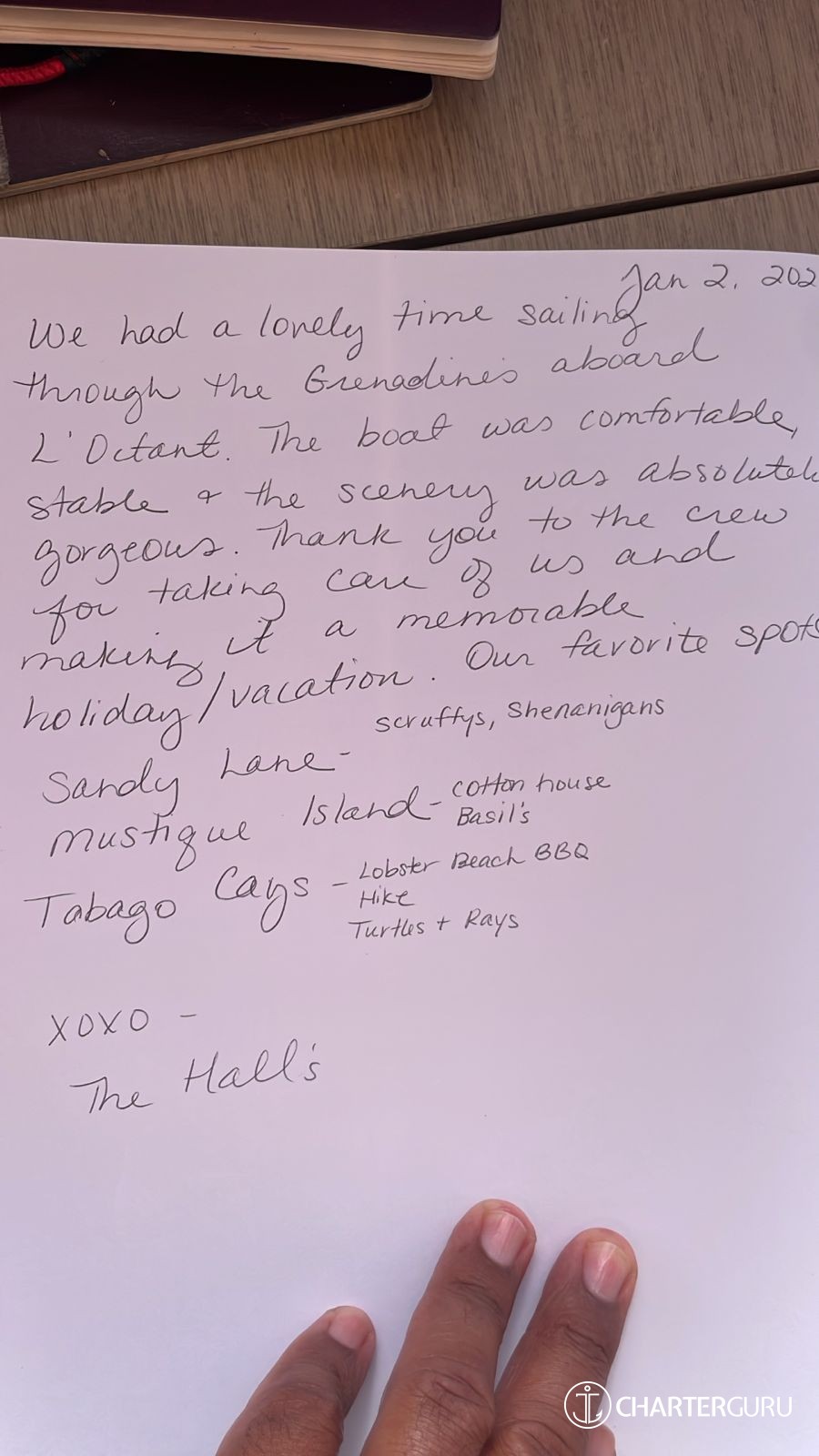 WINTER 2025/2025: Caribbean/Leenward islands Captain only rate: $9,800 / week Captain’s Services Include: - Provisioning Assistance: Expert help to stock the yacht. - Galley Support: Assistance with meal prep and after-meal clean-up. - Coordination of Essentials: Moorings, anchoring, trash, ice, and more. - Water Activities: Orchestrating fun experiences on and in the water. Local Knowledge: - Guidance on cruising grounds and onshore activities. - Personalized recommendations for restaurants and excursions. - Engaging safety briefings and curated themed playlists. Included Yacht Amenities: - Snorkel gear, 2 paddleboards, Premium linens, towels, toiletries, and onboard WiFi starlink available at extra cost). - Sunscreen, bug spray, and indoor entertainment. RATE DOES NOT INCLUDE: Provisioning requests (inquire for further details) Cancellation insurance and private insurance Airport transfers to/from yacht base Personal Expenses MARTINIQUE & GUADELOUPE : 8,5% (in case of embarkation in Martinique or Guadeloupe) WI-FI (Starlink) available with extra - opening service with 50 Go costs $250 and additional 50 Go costs $100 GRATUITY: It is customary to tip your crew at the end of your charter. The amount you leave is totally at your discretion and should be based on the level of service provided. The suggested gratuity is 15%-20% of the total charter fee. MEDITERANNEAN SEASON 2026 : 31/05/2026 14/08/2026: €12,500 /week + VAT* 15/08/2026 - 08/11/2026: €10,600 / week + VAT* *VAT FRANCE 20% based on charter free ITALY: 22% based on charter free Included: Private yacht Insurance for the yacht and the passengers (civil liability) Skipper Use of on-board leisure equipment (snorkeling, paddle boards, sea scooter, board games) Optional Extras: Hostess: €1,520 / week Cook: €1,680 / week Minimum 3 nigths For 6 nights or less, divide the weekly rate by 7 nights and multiplie by 6 nights. For 5 nights or less, divide the weekly rate by 6 and multiplied by the number of nights. Delivery fee: Ajaccio - Bonifacio: €250 Ajaccio - Olbia: €500 Bonifacio - Olbia: €250 *For other ports, please contact the Central Agent. WI-FI (Starlink) available with extra - opening service with 50 Go costs €250 and additional 50 Go costs €100 A crew gratuity, at your discretion, but typically 10% to 20% of the rate is not included All rates are for the entire yacht and are subject to change without notice prior to actual reservation.What is the cabin arrangement of L’OCTANT?