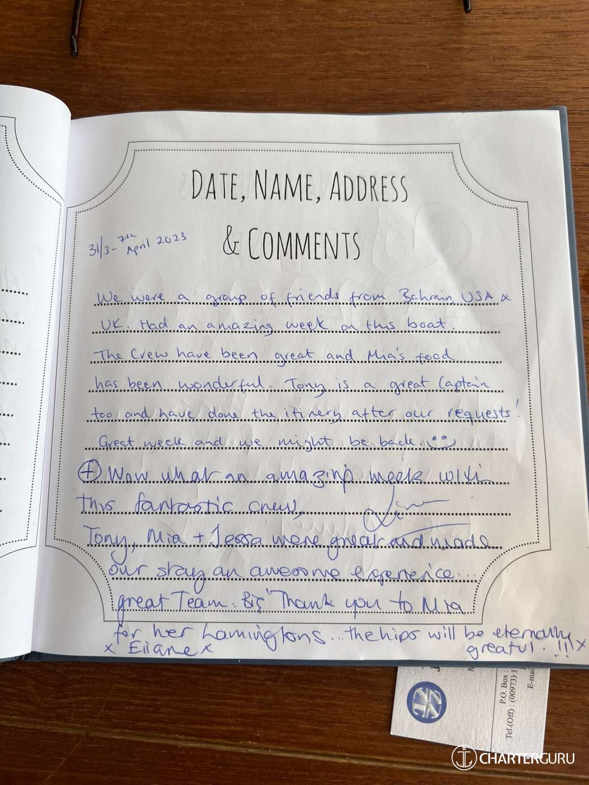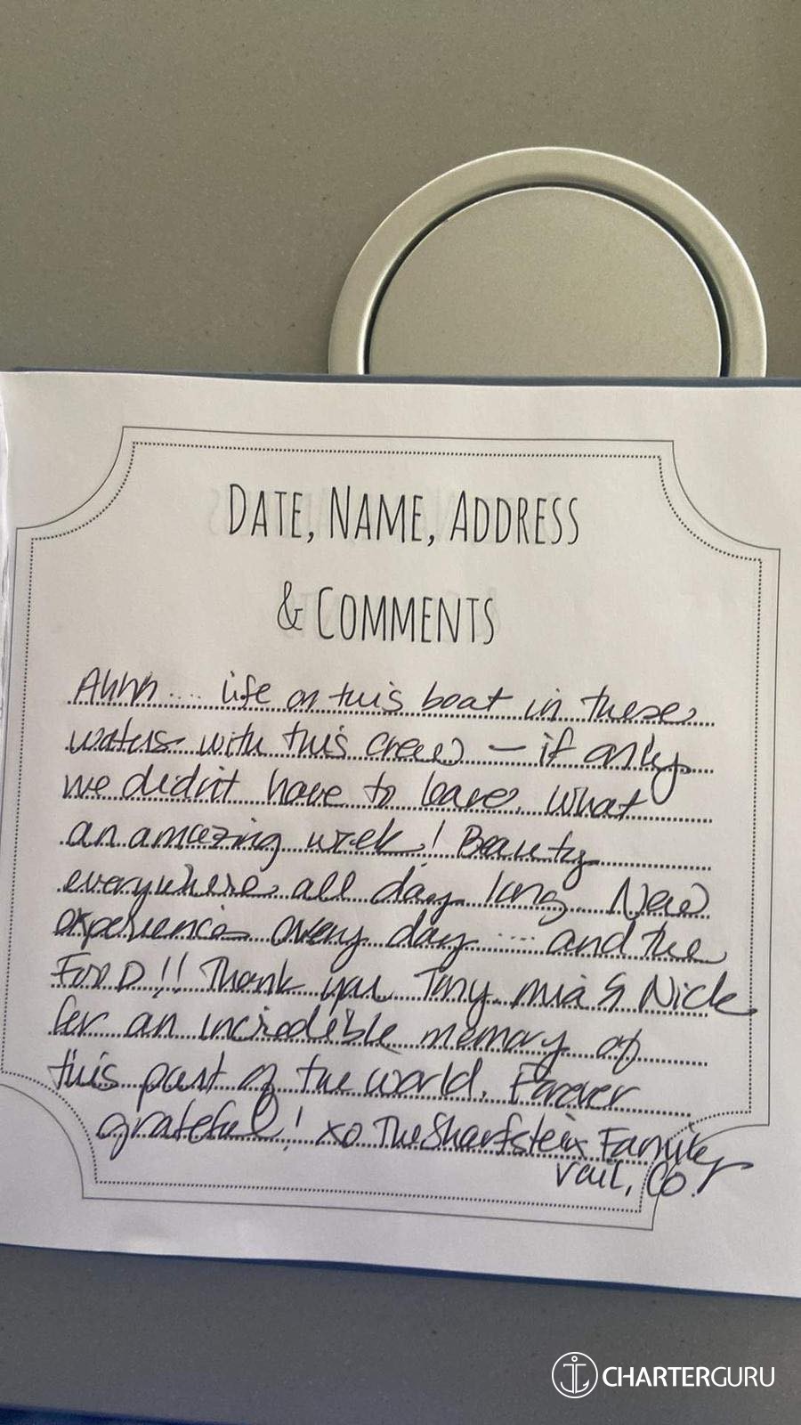 We are so grateful to have spent such a wonderful debut charter week with the two of you onboard Mare Blu. We have been touched by your hospitality, warmth and generosity of spirit.