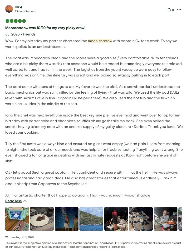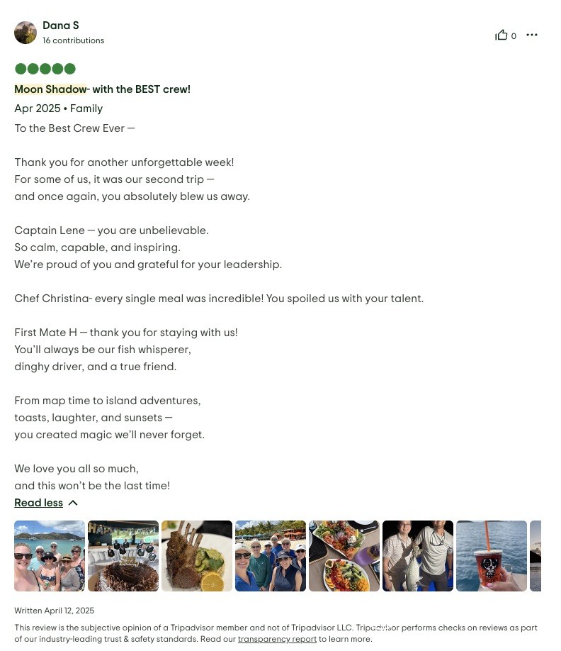 For our family of 9, including 7 adult “children,” Moon Shadow was the best vacation we’ve ever enjoyed! The water activities offered hours of laughter and competition! The crew (thanks to Captain Lene and Deck Hand H) were not only capable, but endlessly accommodating! Our food (thank you, Chef Richard) was both beautiful and delicious, every meal topped the one before!! The boat was immaculate, stunning and spacious! The views were breathtaking, both on the boat and during shore excursions. The shore excursions were tailored to our desires…shopping, beach football, searching for the perfect island cocktail. The name “Moon Shadow” will forever bring a smile to our faces!! HIGHLY RECOMMEND, with no reservations!!
