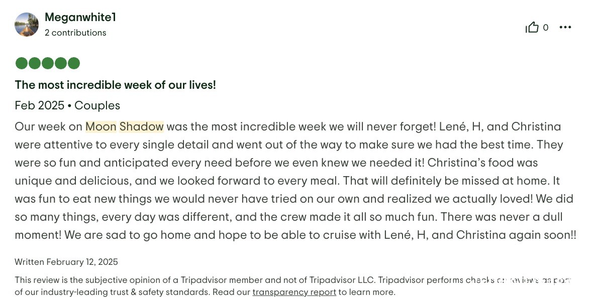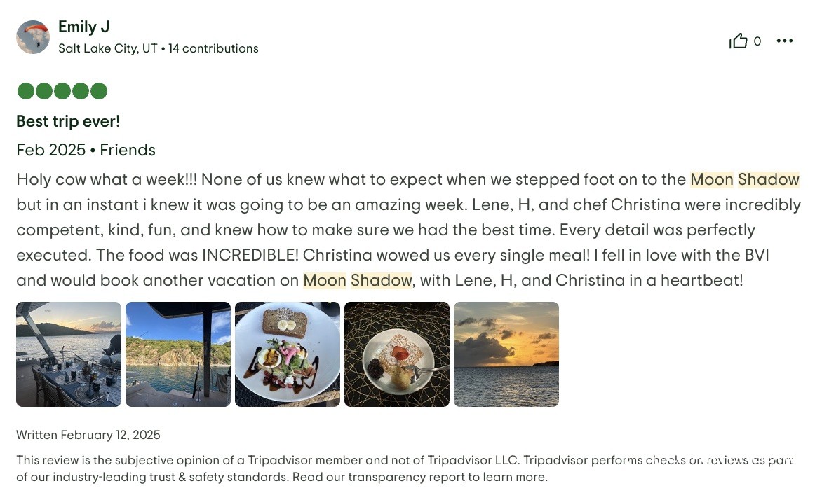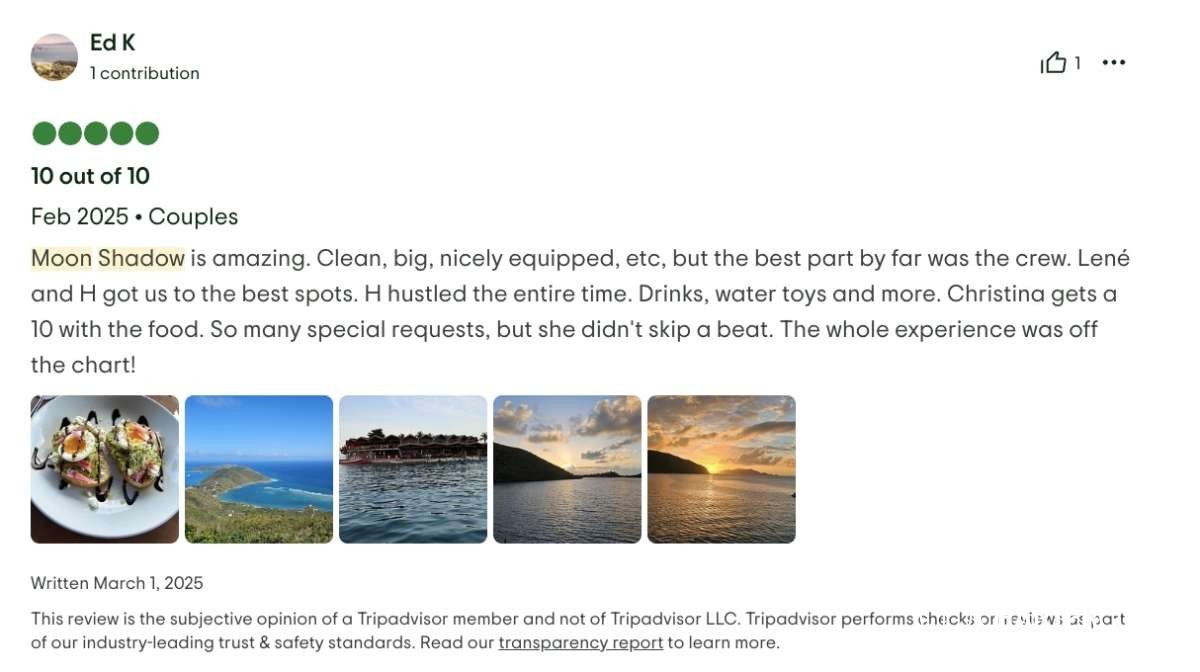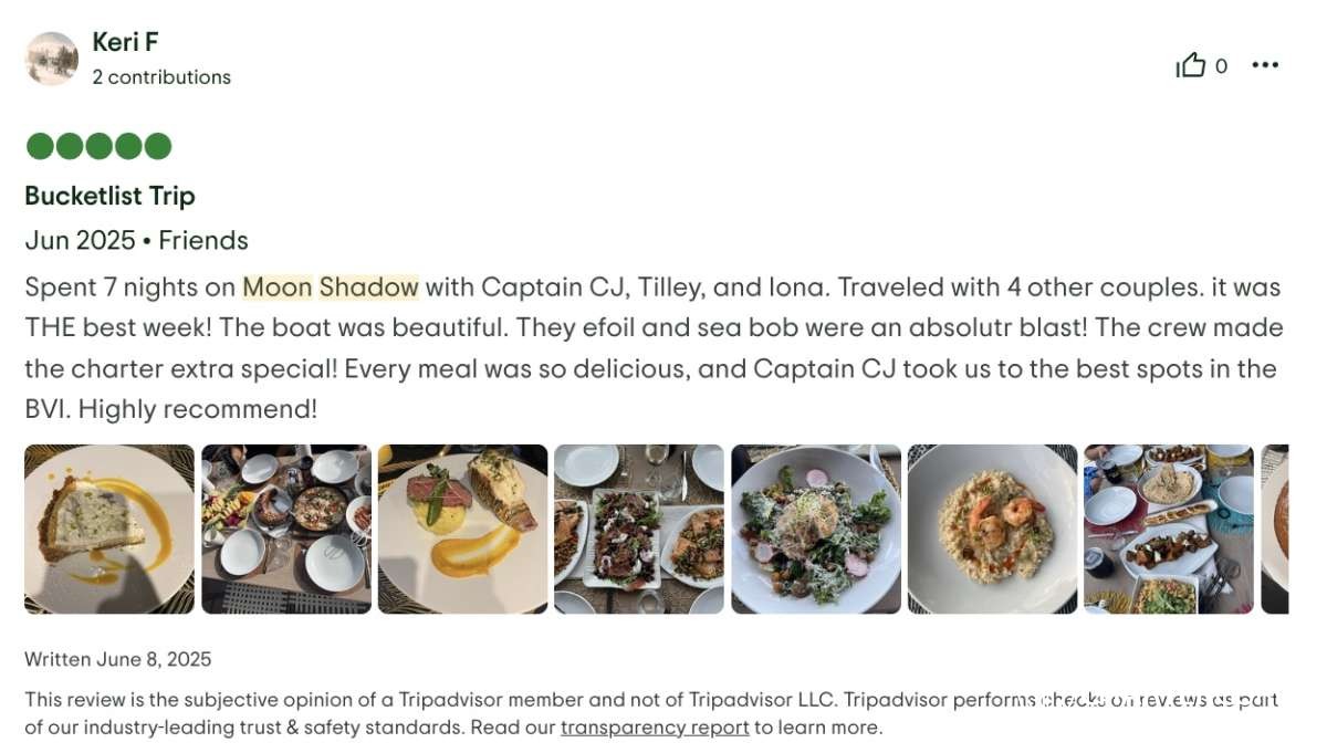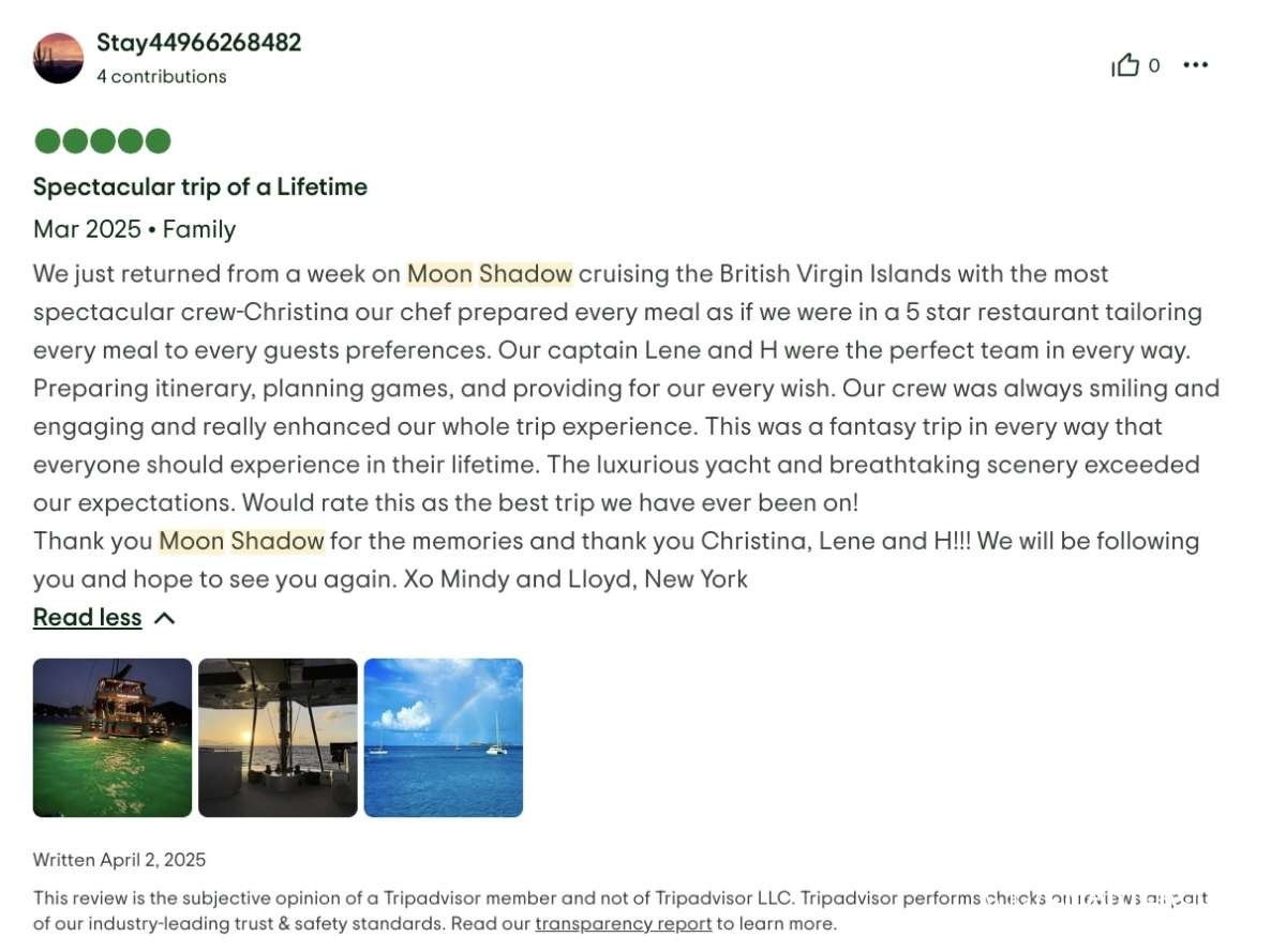 I cannot write high enough praise for the Moon Shadow and its crew, Captain Lene, Deckhand H, and Chef Richard. The experience was fabulous from the time we arrived in the islands and the service was white glove. Each excursion the crew planned was exactly what our group was looking for and their insider knowledge of the island made everything a breeze. The food was absolutely top-notch and you're lucky to be getting Chef Richard because he easily could be the head chef at a Michelin Star restaurant. If you are looking for the perfect getaway in the BVI, stop looking because you've found it aboard the Moon Shadow.