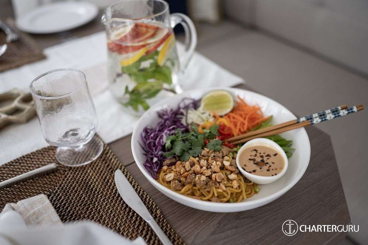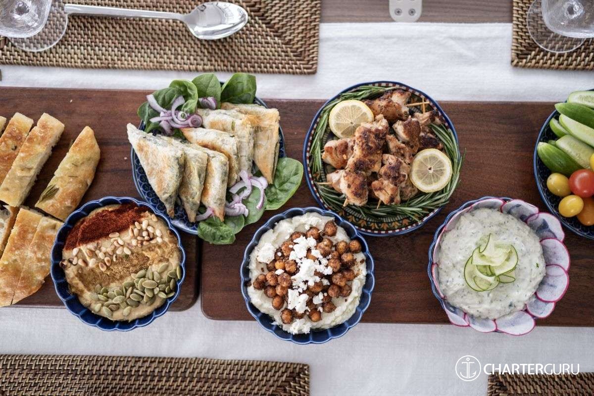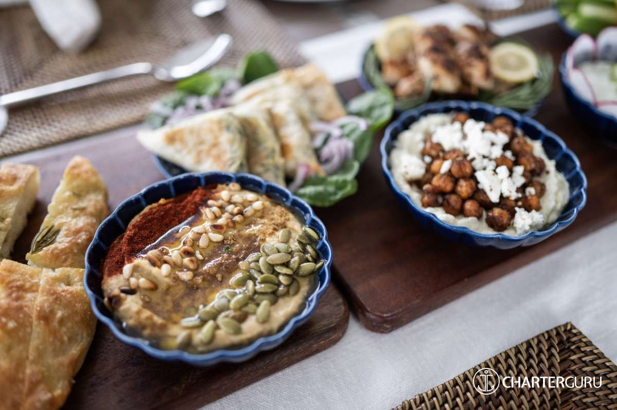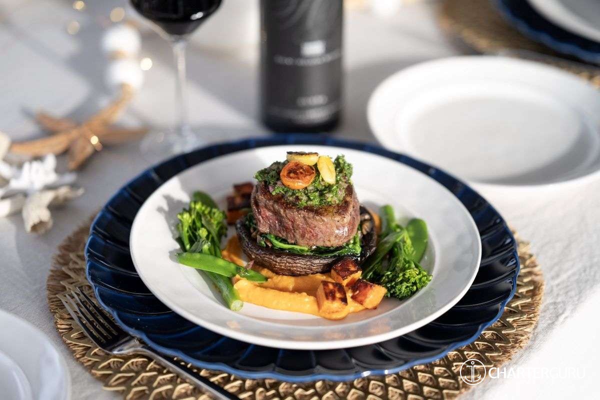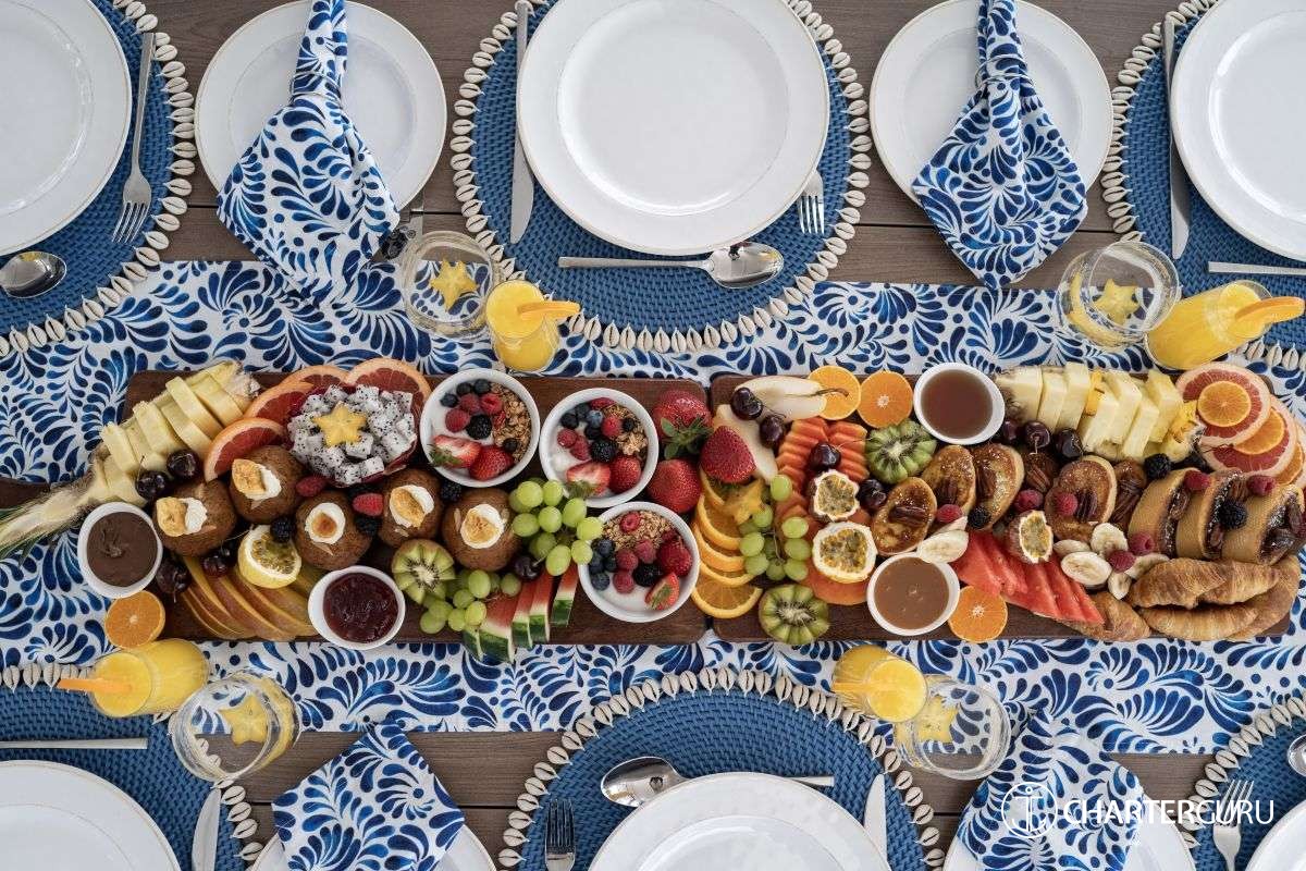 LOCAL FARE: Includes: 7 breakfasts, 5 lunches & 5 dinners. Requires 2 lunches and 2 dinners ashore at client expense. -For local fare, deduct $150 per person off the charter rate