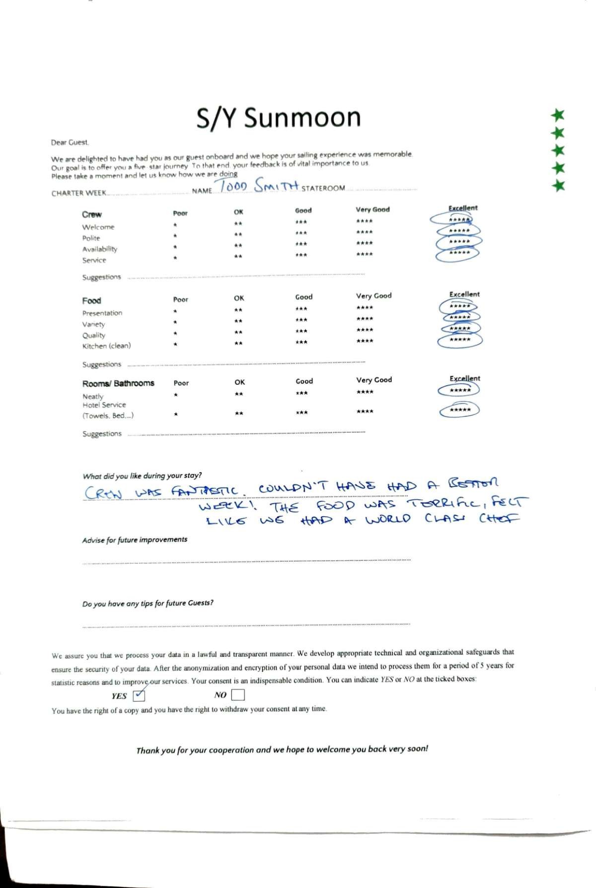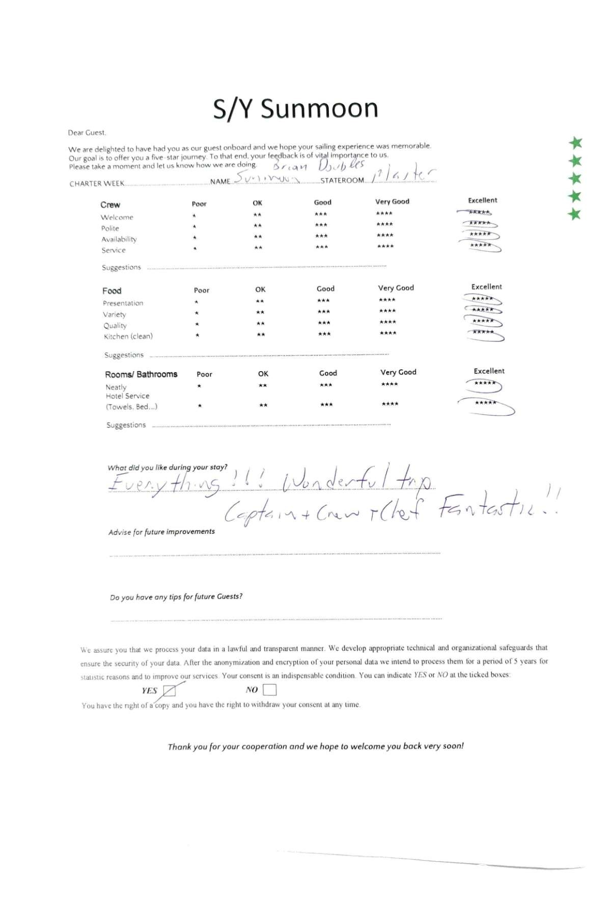 Crew gratuity is customary and ranges from 10% to 20%, it is given at the Charterer's discretion.