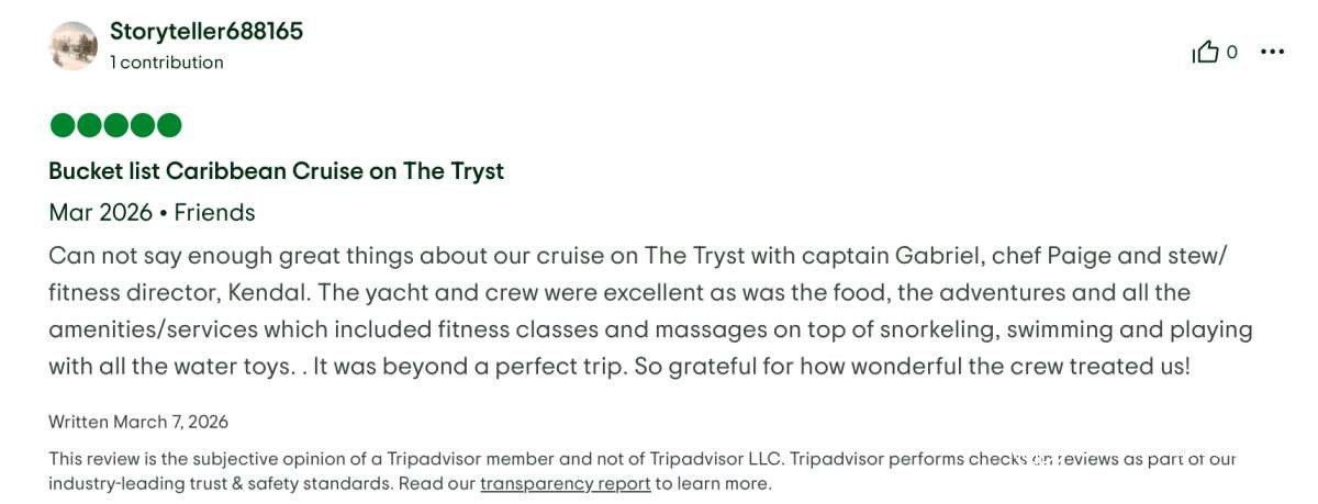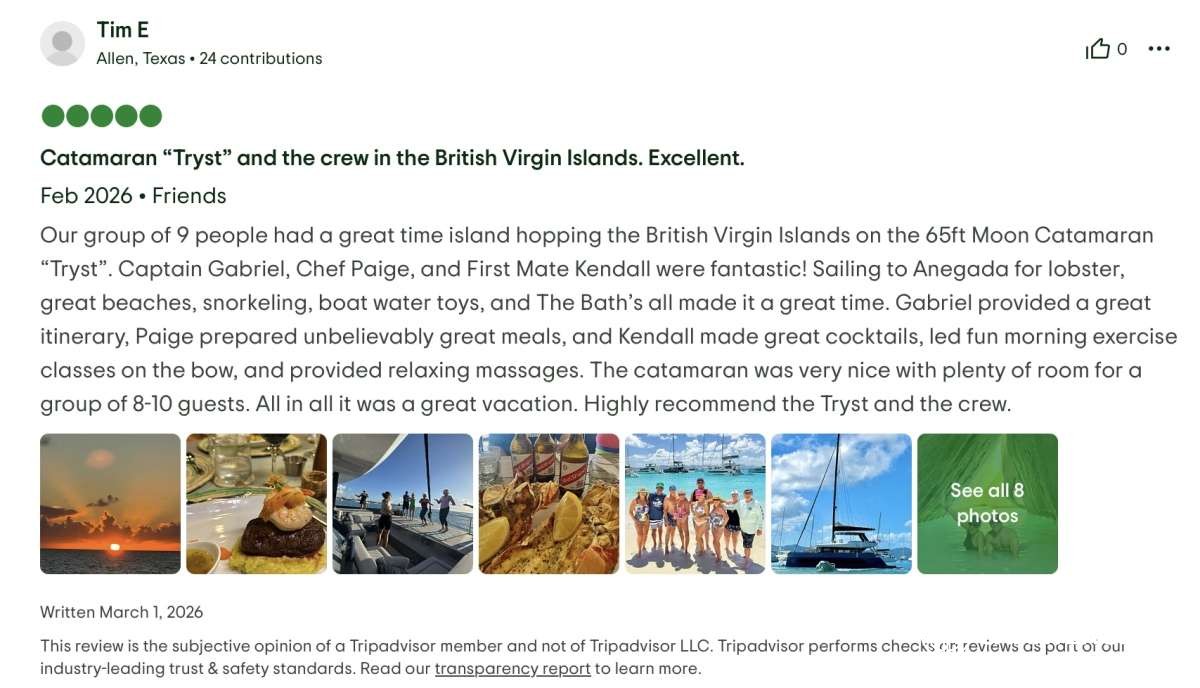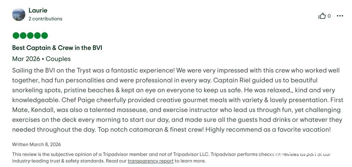 "Tryst". Captain Gabriel, Chef Paige, and First Mate Kendall were fantastic! Sailing to Anegada for lobster, great beaches, snorkeling, boat water toys, and The Bath's all made it a great time. Gabriel provided a great itinerary, Paige prepared unbelievably great meals, and Kendall made great cocktails, led fun morning exercise classes on the bow, and provided relaxing massages. The catamaran was very nice with plenty of room for a group of 8-10 guests. All in all it was a great vacation. Highly recommend the Tryst and the crew.