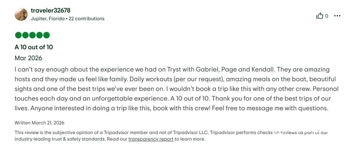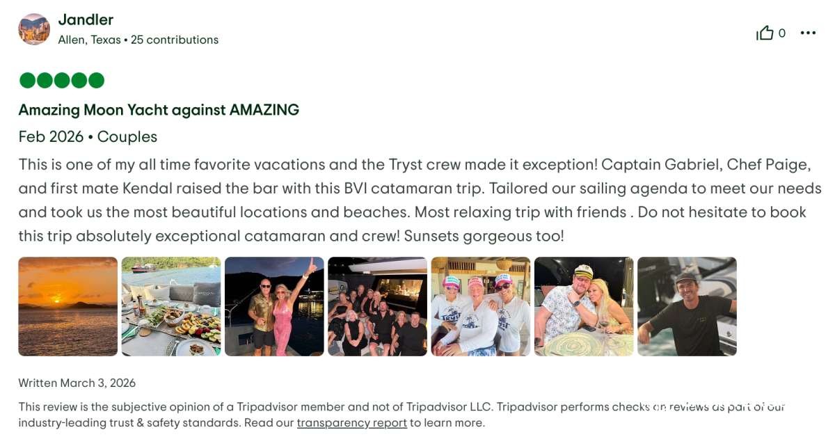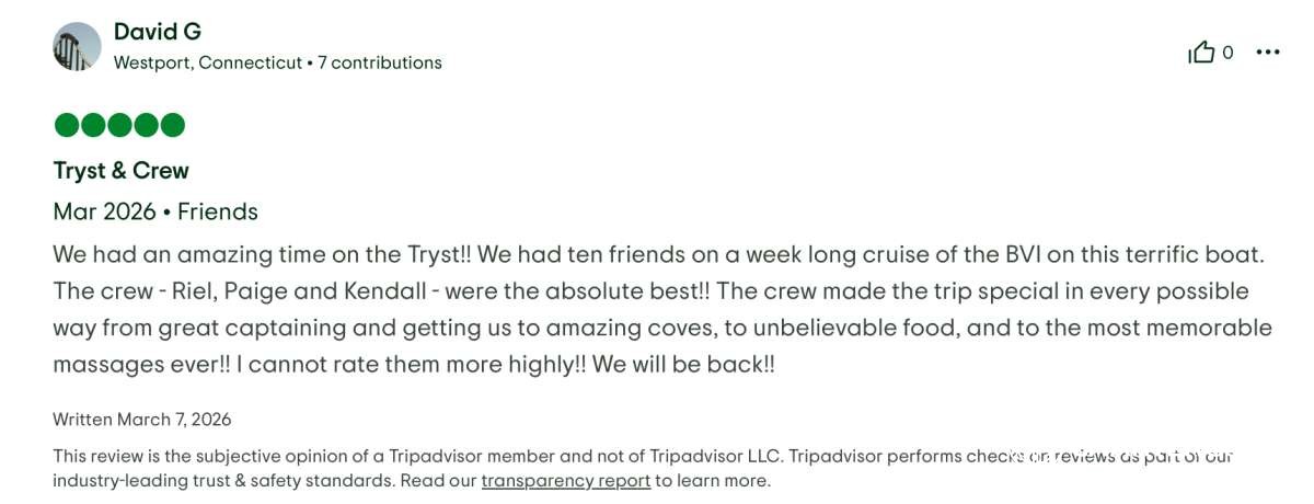 The professionalism, hospitality, and attention to detail from this crew elevated the entire journey. If you're considering a charter in the BVI, Tryst and this crew set the gold standard.